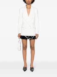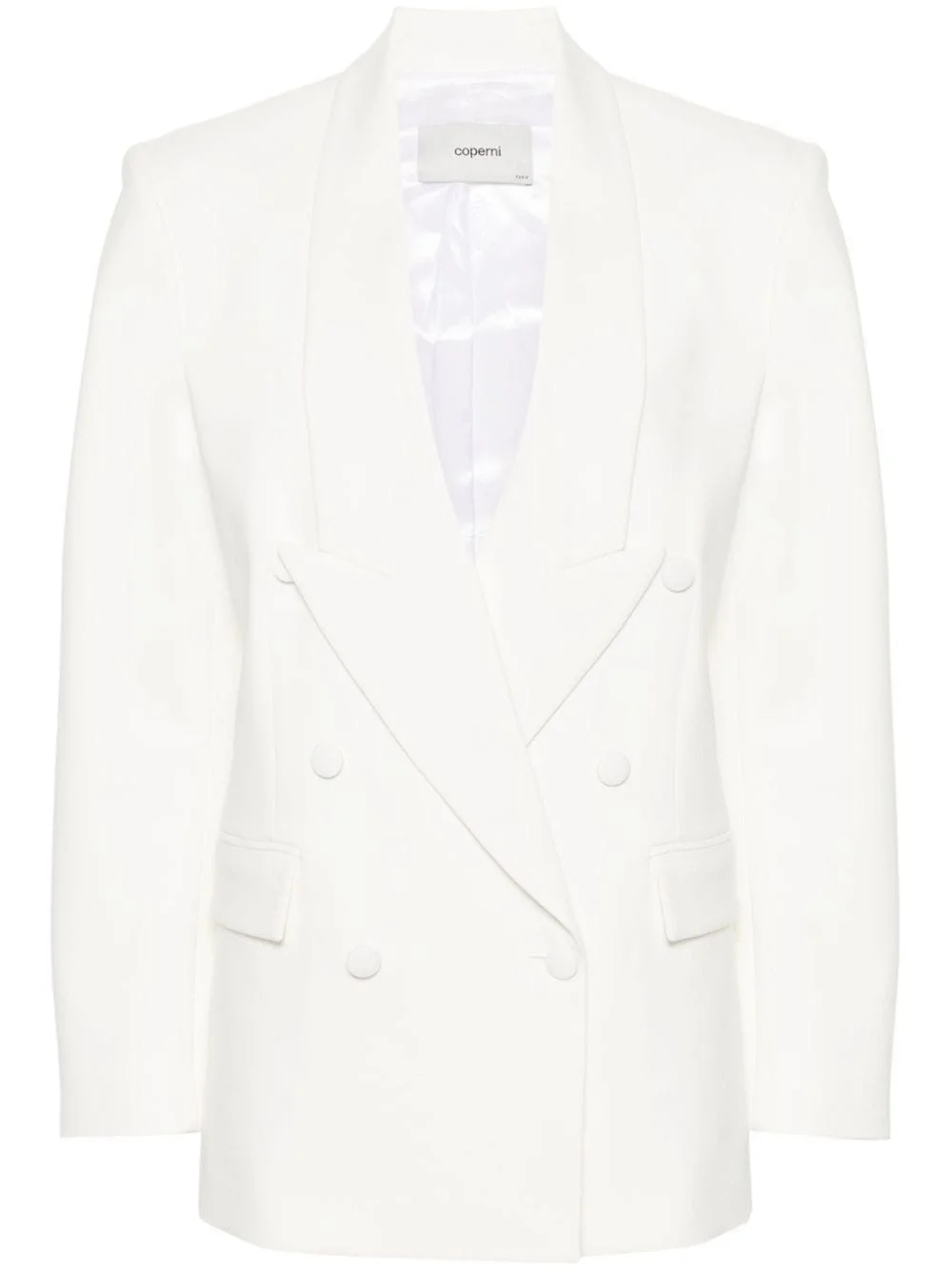 double-breasted tailored blazer Highlights - White - Twill weave - Tailored cut - Peak lapels - Shoulder pads - Long sleeves - Buttoned cuffs - Two side flap pockets - Full lining - Double-breasted button fastening Made in France Composition Outer: Viscose 82%, Virgin Wool 15%, Spandex/Elastane 3% Lining: Viscose 100% SIZE & FIT Model measurements Height 5 ft 10 in(1.78 m) Bust/Chest 32.67 in(83 cm) Hips 35.43 in(90 cm) Waist 23.22 in(59 cm) FittingInformation Designed for a slim fit that sits just away from the body offering a close yet comfortable fit The internal shoulder pads offer a structured shape Made from a midweight fabric This piece fits true to size – take your usual size