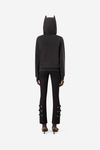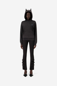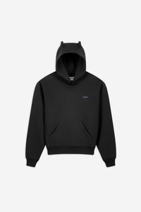 A cozy essential with a rebellious twist. The Horn Hoodie in a washed black organic cotton brings Coperni's signature attitude to a classic silhouette. It features subtly sculpted horn-like details on the hood and a minimalist embroidered logo in blue on the chest. The cropped yet relaxed shape offers an effortless comfort for everyday. DETAILS - Composition: Cotton/Polyester - Made in: Portugal - Sku: COPJS15BIS523W