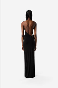 Black maxi dress crafted from lightweight jersey that flows effortlessly for a figure-sculpting silhouette that gently flares at the bottom for ease of movement. The draped neckline softly settles into a deep U-shape supported by thin spaghetti straps, each embellished with a removal brooch shaped like silver clothes peg. The dress was showcased at Coperni's standout SS25 show held at Disneyland Paris, a catwalk ode to childhood and the magic of fairytales. The silver clip is a nod to Disney's classic animations and particularly laundry scenes featuring enchanting female characters, such as Snow White and Cinderella who thrive, flourish and forever delight in stories that continue to capture the imagination. Details Black COPR160F5022 100% Polyester Made in Italy