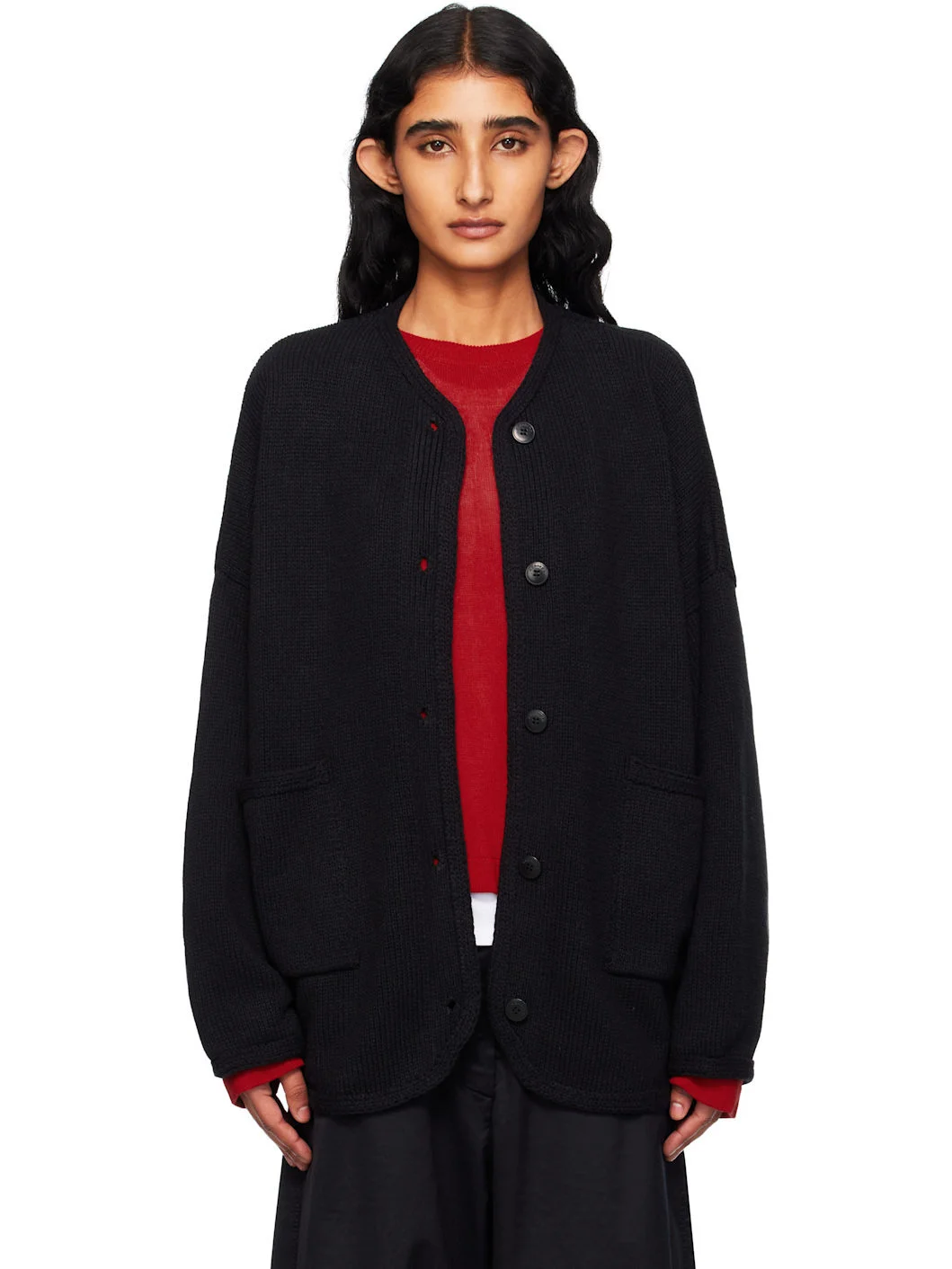 Knit ECOTEC® recycled cotton-blend cardigan. · Oversized · Crewneck · Button closure · Patch pockets at front · Shirttail hem · Dropped shoulders · Logo-engraved hardware Supplier color: Black 80% ecotec cotton, 20% ecotec pes. Made in Spain 252909F095012