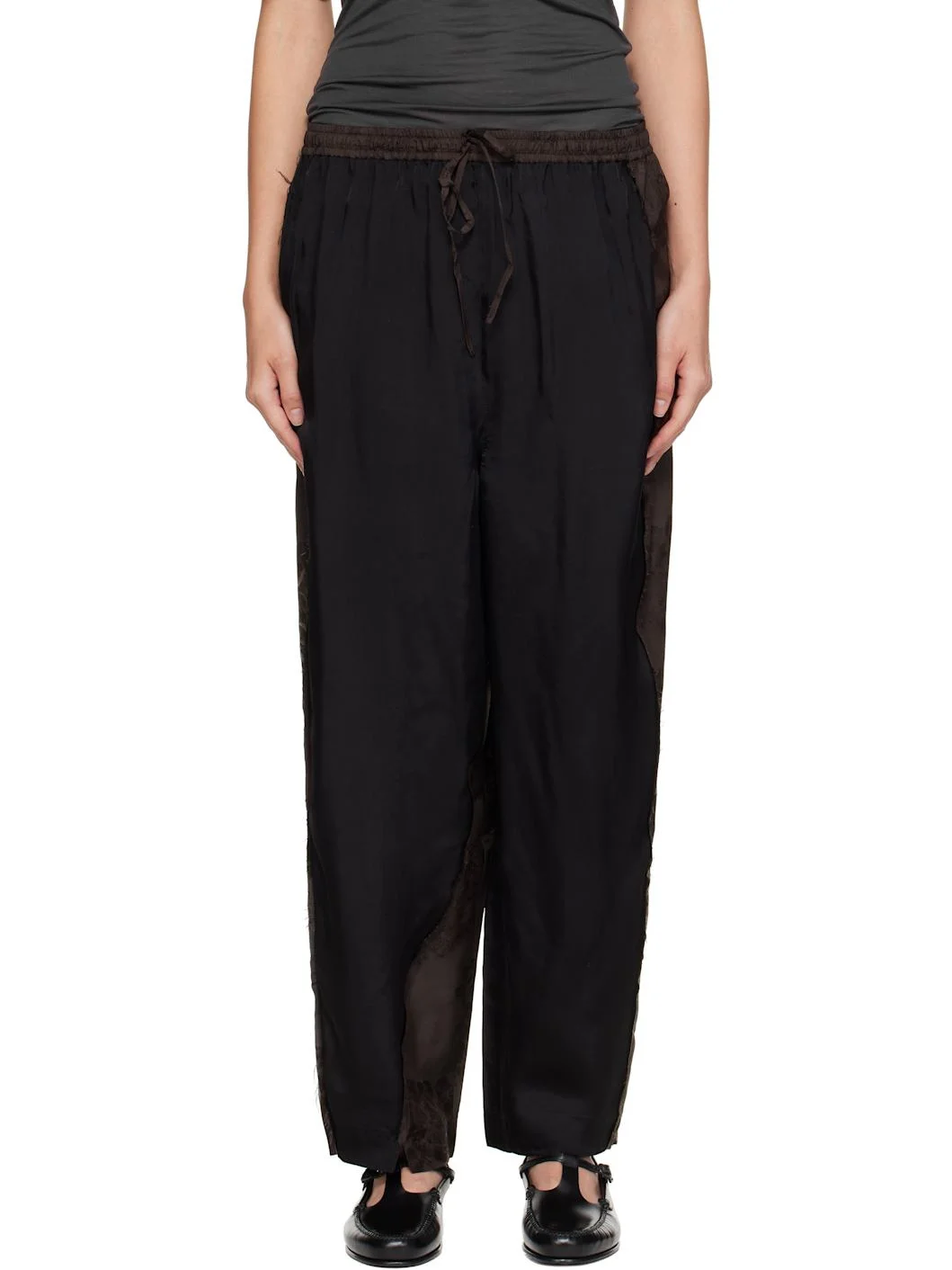 Wide-leg satin trousers. · Raw-edge satin panels with floral jacquard pattern · Drawstring at elasticized waistband · Two-pocket styling · Notch at cuffs Supplier color: Dark Brown Body: 57% viscose, 43% cupro. Trim: 100% viscose. Made in Spain 251909F087019