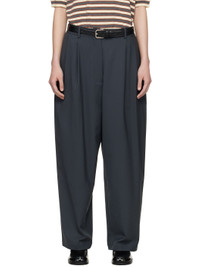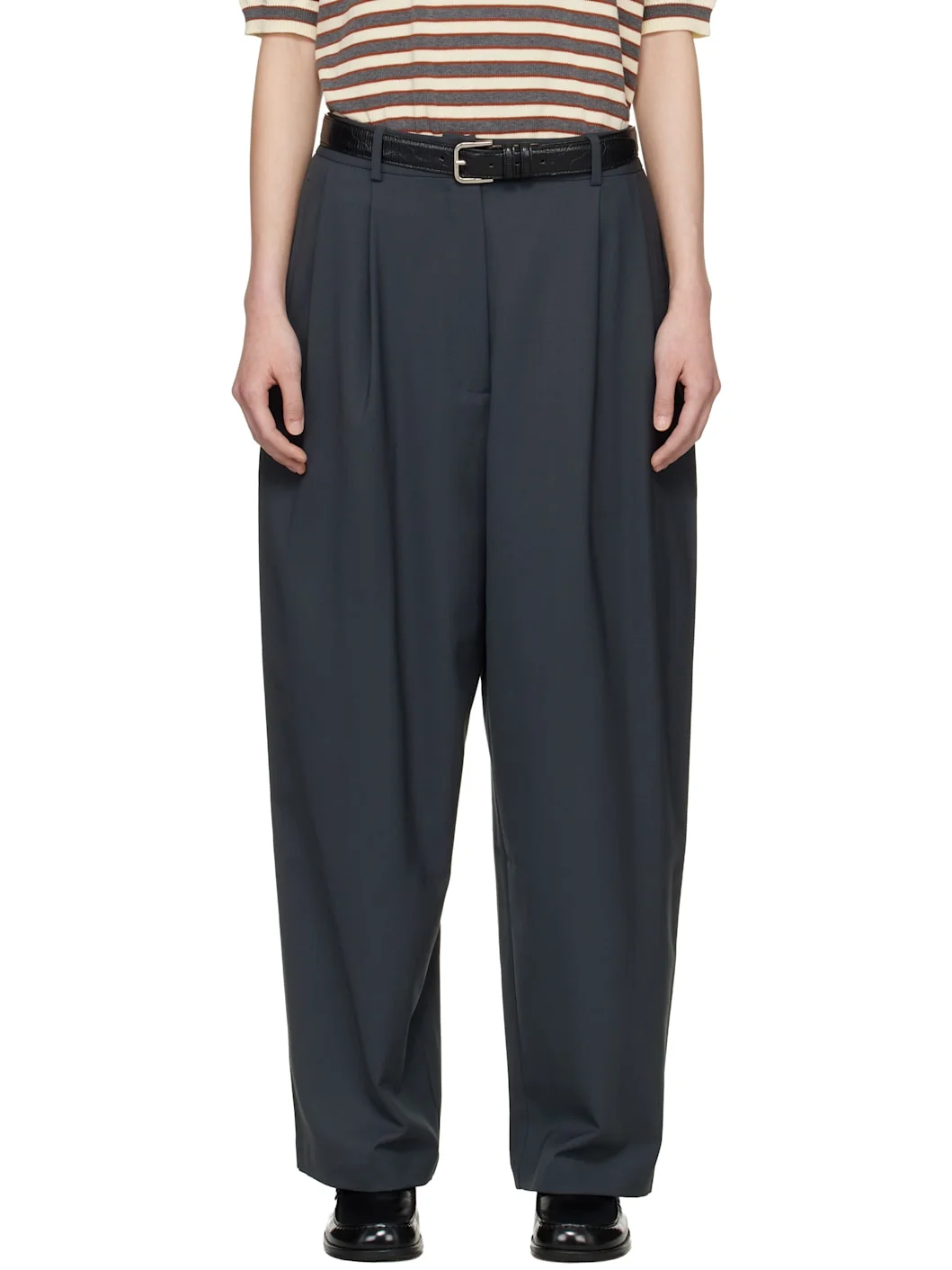 Woven stretch virgin wool-blend trousers. · Loose-fit · Mid-rise · Belt loops at partially elasticized waistband · Two-pocket styling · Zip fly · Pleats at front · Darts at back waist Supplier color: Ebony 52% polyester, 43% virgin wool, 5% elastane. Made in Spain 261909F087005