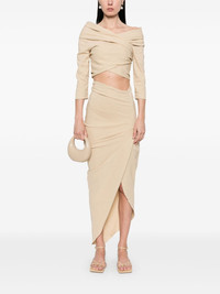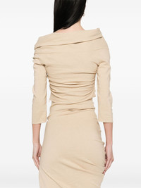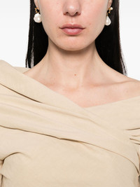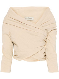 Mite top Highlights - Beige - Concealed side zip fastening - Off-shoulder - Three-quarter length sleeves - Draped design Imported Composition Hemp 53%, Viscose 44%, Elastane 3% SIZE & FIT Model measurements Height 5 ft 10 in(1.78 m) Bust/Chest 33.46 in(85 cm) Hips 36.22 in(92 cm) Waist 23.22 in(59 cm) FittingInformation Designed for a slim fit that sits just away from the body offering a close yet comfortable fit Cropped in length Made from a midweight stretch fabric, this piece offers elasticity and flexibility when worn Washing instructions Dry Clean Only