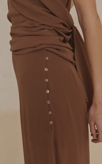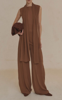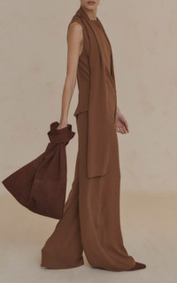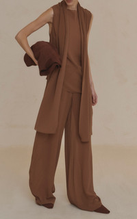 PRODUCT DETAILS - Relaxed fit, high-rise, wide legs, floor length - Button fastening - Partially lined - Composition: 100% Silk - Color: brown - Dry clean only - Pre Fall '25