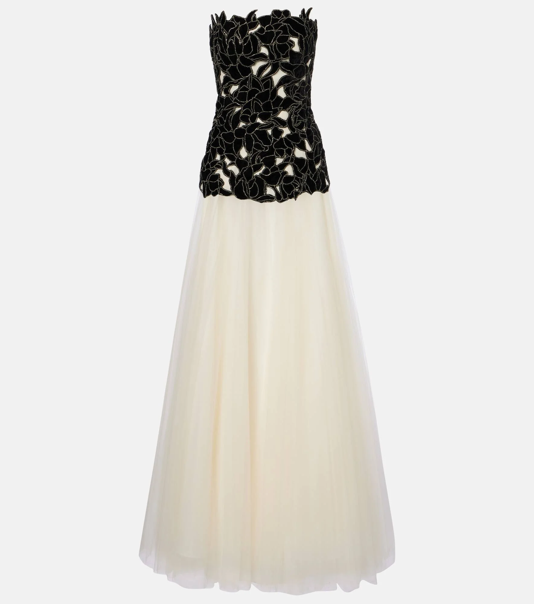 Based in Athens, Costarellos designs ethereal eveningwear that takes inspiration from art of ancient Greece. The Alessi gown is crafted from soft tulle and features a contrasting bodice with an embellished floral motif. Product Details - Material: 100% polyamide - Care instructions: dry clean - Made in Greece - Designer color name: Ecru-Black - Item color: white, black - Embroidery: 50% brass, 50% glass - Lining: 100% polyester - Boning - Closure: concealed zipped back - Item number: P01080017 Size & Fit - Fits large to size - we recommend trying one size smaller - Strapless - Internal boned corset for support - Cinched waist - Non-stretchy fabric - Height of model is 174cm-68.5" and wears a size FR 34