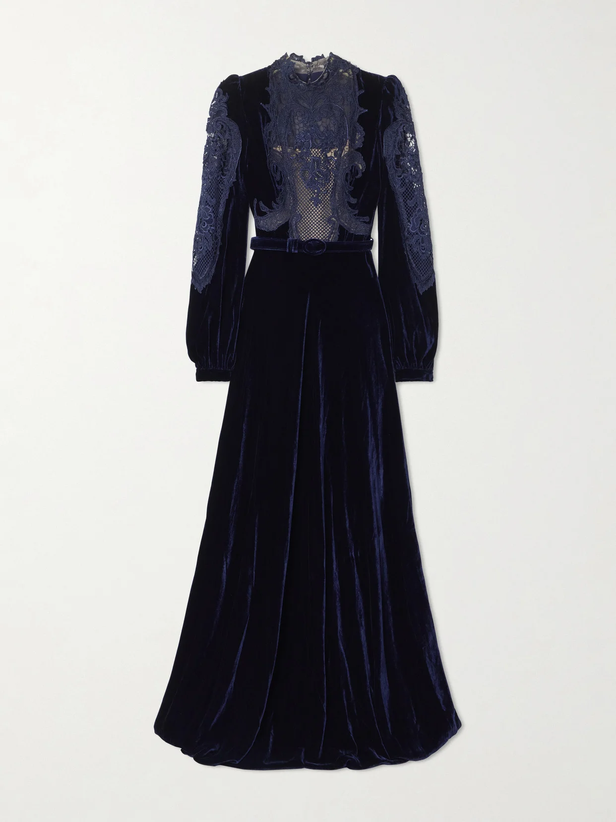 EXCLUSIVE AT NET-A-PORTER. Costarellos' gown has an innate sense of drama. Made from velvet, it's paneled with lace across the bodice and sleeves and belted at the waist. The pronounced shoulders create an artful silhouette.