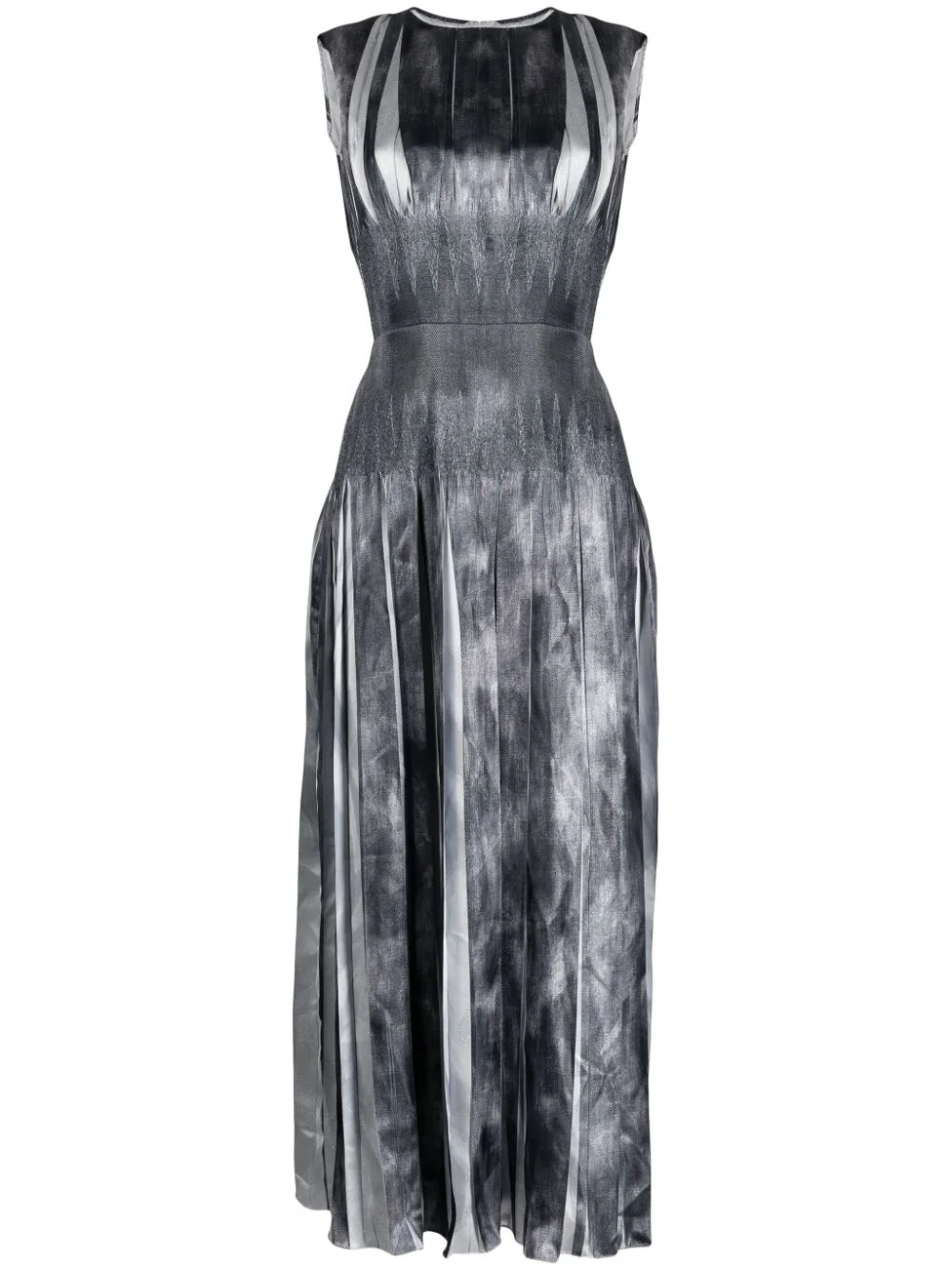 box-pleated sleeveless maxi dress Highlights - Anthracite grey/silver-tone - Metallic effect - Box-pleat design - Round neck - Concealed rear zip fastening - Sleeveless - Fitted waistline - Pleated skirt - Flared hem - Ankle-length Imported Composition Outer: Polyester 86%, other fibers 11%, Nylon 2%, Elastane 1% Lining: Polyester 100% SIZE & FIT Model measurements Height 5 ft 10 in(1.77 m) Bust/Chest 28.74 in(73 cm) Hips 35.82 in(91 cm) Waist 24.4 in(62 cm) Washing instructions Dry Clean Only