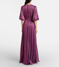 Based in Athens, Costarellos designs ethereal eveningwear that takes inspiration from art of ancient Greece. Cut from an iridescent georgette, the Brennie gown is draped throughout with blouson sleeves and a removable belt. Product Details - Material: 95% polyester, 5% polyamide - Care instructions: dry clean - Made in Poland - Color: purple - Designer color name: Grape Purple 1649 - Closure: concealed zipped back - Long vent - Item number: P01127432 Size & Fit - True to size - Low back - Cinched waist - Adjustable at the waist - slit length 99cm-39" - The model seen in the picture is 178cm-5'10" and wearing a size FR 36