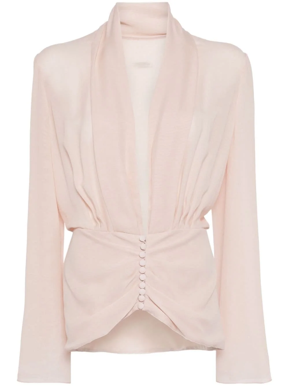 buttoned silk blouse Highlights - Light pink - Silk - Ruched detailing - V-neck - Front button fastening - Long sleeves - Straight hem Imported Composition Lining: Polyester 100% Outer: Silk 100% Washing instructions Dry Clean Only