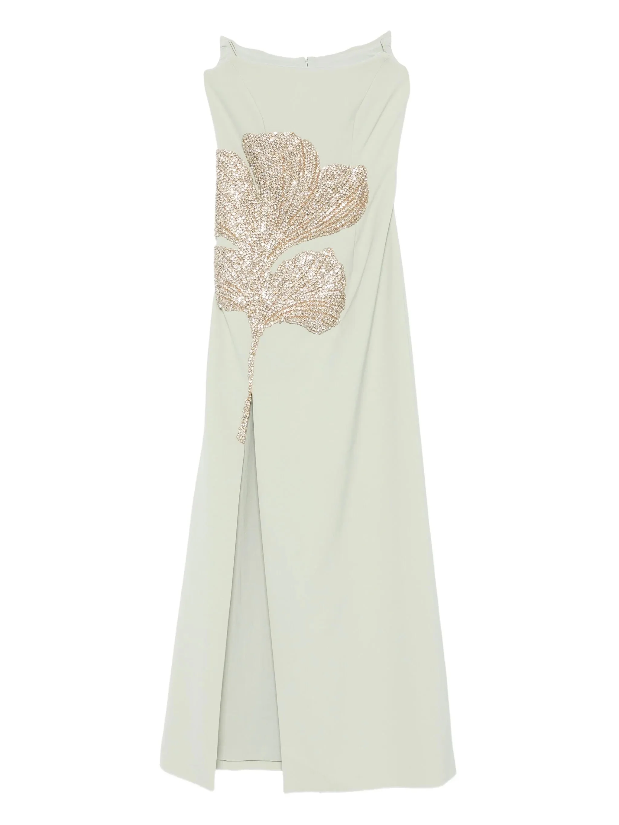 dusty mint leaf embellishment beading details strapless neckline front slit - Color: GREEN - Made in: Lithuania - Designer Style ID: PF2528 FARANNA DMINT Composition and care Outer Composition Polyester: 92.0%, Lining Composition Polyester: 100.0%, Outer Composition Polyurethane: 8.0%