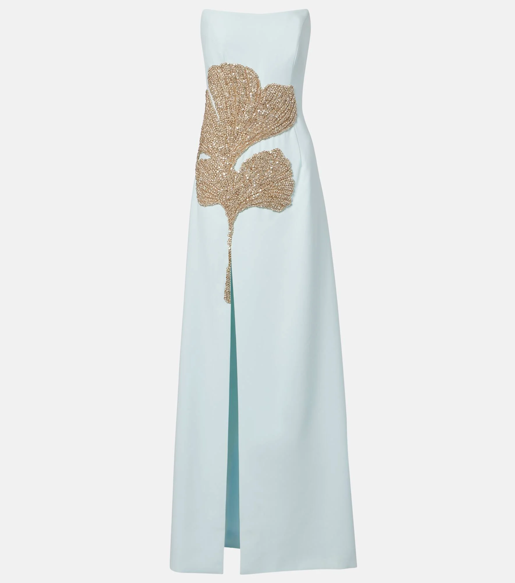 The Faranna gown from Costarellos is crafted from crepe to a sleek silhouette with a strapless, structured bodice. Shimmering crystals adorn the front floral embroidery, finished with a deep slit to create a stem-like effect. Product Details - Material: 92% polyester, 8% polyurethane - Care instructions: specialist clean - Made in Lithuania - Designer color name: Blue Waters 194 - Item color: blue - Lining: 100% polyester - Closure: zipped back - Built-in bustier - Item number: P01058426 Size & Fit - True to size - Strapless - Internal boned corset for support - Fitted - Non-stretchy fabric - The model seen in the picture is 178cm-5'10" and wearing a size FR 36