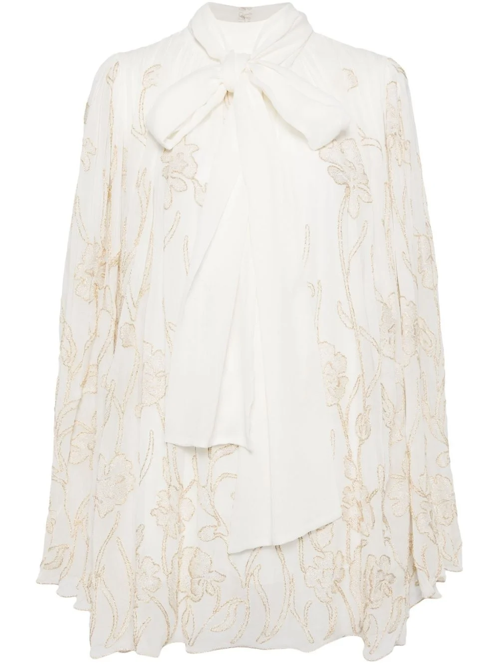 floral-embroidered mini dress Highlights - White - Silk blend - Georgette - All-over floral embroidery - Fully pleated - Pussy-bow collar - Long sleeves - Lettuce hem - Thigh-length Imported Composition Lining: Polyester 100% Outer: Silk 50%, Polyester 30%, Rayon 15%, Polyamide 5% SIZE & FIT Model measurements Height 5 ft 10 in(1.77 m) Bust/Chest 31.49 in(80 cm) Hips 35.43 in(90 cm) Waist 25.19 in(64 cm) FittingInformation Designed for a relaxed fit, this piece allows for comfort and movement when worn Made from a midweight non-stretch fabric This piece fits true to size – take your usual size Washing instructions Dry Clean Only