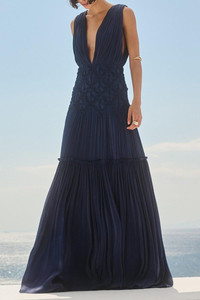 DETAILS AND INSIGHT Costarellos krizia gown in navy blue. 100% PL PES DRY CLEAN Made in Lithuania Style SS24-16-NVY BLUE