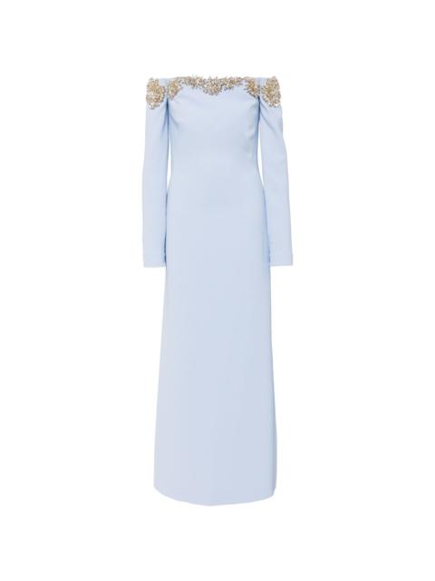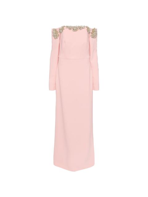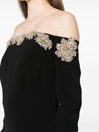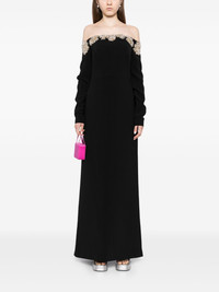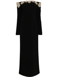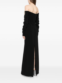 Meline gown Highlights - Black - Crepe texture - Concealed rear hook and zip fastening - Off-shoulder - Square neck - Crystal embellishment - Boned bodice - Open-shoulder sleeves - Cuff zips - Open back - Central rear vent - Full lining - Floor-length Imported Composition Outer: Polyester 92%, Polyurethane 8% Lining: Polyester 100% SIZE & FIT Model measurements Height 5 ft 10 in(1.77 m) Bust/Chest 27.95 in(71 cm) Hips 34.64 in(88 cm) Waist 22.83 in(58 cm) Measurement CHEST 31.49 in(80 cm) LENGTH 61.41 in(156 cm) WAIST 29.13 in(74 cm) SLEEVE LENGTH 24.01 in(61 cm) HIPS 36.22 in(92 cm) FittingInformation Designed for a slim fit that sits just away from the body offering a close yet comfortable fit The moulded cups offer shape and support Made from a midweight non-stretch fabric Washing instructions Dry Clean Only
