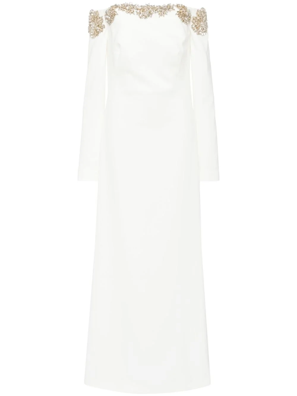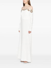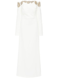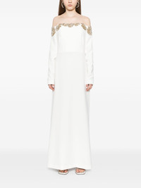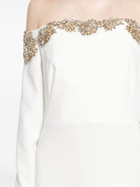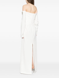 Meline gown Highlights - Ivory - Crepe texture - Concealed rear hook and zip fastening - Off-shoulder - Bustier-style neckline - Crystal embellishment - Open-shoulder sleeves - Cuff zips - Boned bodice - Central rear vent - Full lining - Floor-length Imported Composition Outer: Polyester 92%, Polyurethane 8% Lining: Polyester 100% SIZE & FIT Model measurements Height 5 ft 10 in(1.77 m) Bust/Chest 27.95 in(71 cm) Hips 34.64 in(88 cm) Waist 22.83 in(58 cm) Measurement CHEST 33.07 in(84 cm) SLEEVE LENGTH 24.01 in(61 cm) HIPS 37.79 in(96 cm) LENGTH 61.41 in(156 cm) WAIST 30.7 in(78 cm) FittingInformation Designed for a slim fit that sits just away from the body offering a close yet comfortable fit The moulded cups offer shape and support Made from a midweight non-stretch fabric