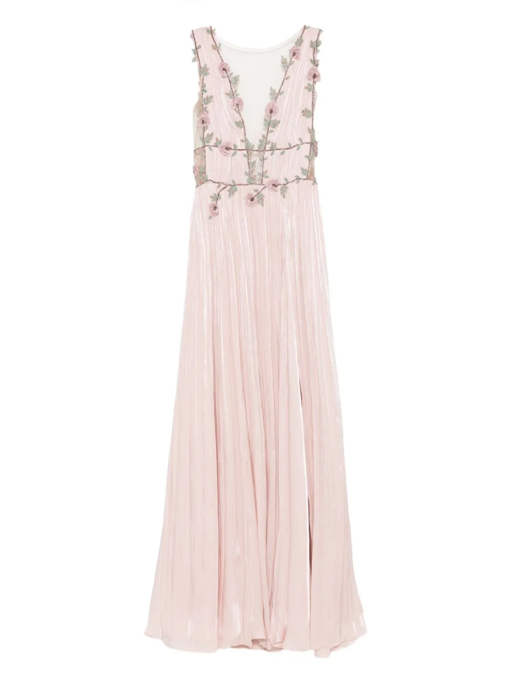 floral-embellished pleated maxi dress Highlights - Pink - Pleated skirt - Sleeveless - Floral embroidery - Sheer yoke Imported Composition Polyester 100% SIZE & FIT Model measurements Height 5 ft 9 in(1.75 m) Bust/Chest 34.64 in(88 cm) Hips 36.61 in(93 cm) Waist 26.37 in(67 cm) Washing instructions Dry Clean Only
