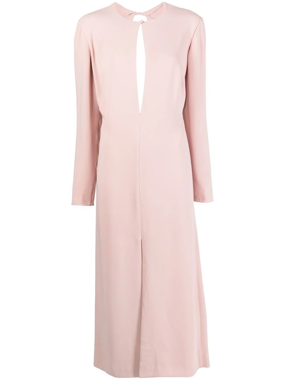 open back evening dress blush pink round neck long sleeves drop shoulder front button fastening front slit ankle-length rear twist detailing open back Imported Composition Polyester 100% SIZE & FIT Model measurements Height 5 ft 10 in(1.77 m) Bust/Chest 31.49 in(80 cm) Hips 35.43 in(90 cm) Waist 25.19 in(64 cm) FittingInformation This piece fits true to size. We recommend you get your regular size Designed for a close fit at the bust and waist, but loose at the hip Made with a mid-weight non-stretch fabric