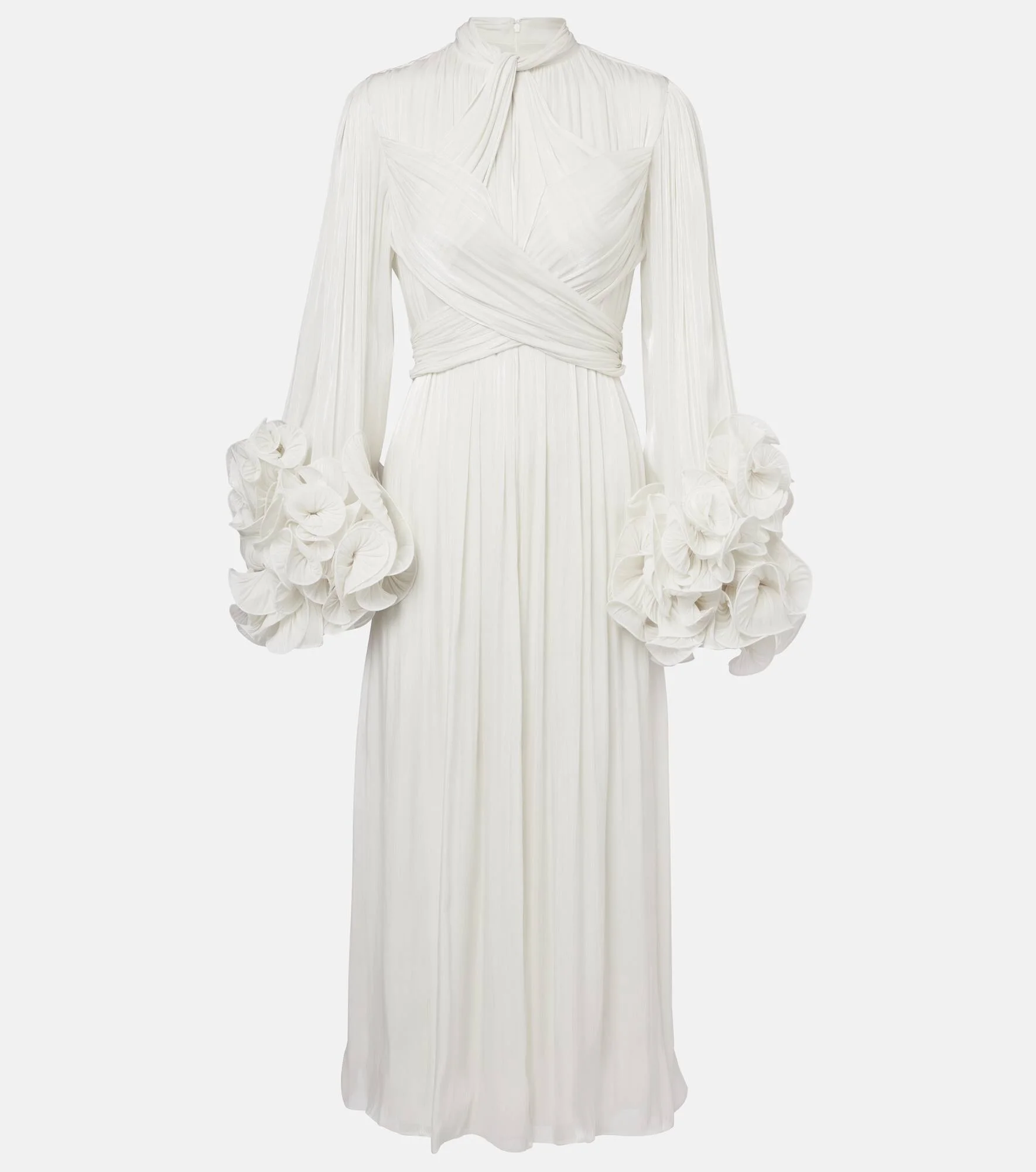 Based in Athens, Costarellos designs ethereal eveningwear that takes inspiration from art of ancient Greece. This sophisticated gown is cut to a midi silhouette, featuring voluminous ruffles at the cuffs and delicate pleats throughout. Product Details - Material: 100% polyester - Care instructions: dry clean - Made in Poland - Designer color name: Off-White - Item color: white - Closure: invisible zipper - Item number: P01044804 Size & Fit - True to size - Cinched waist - Non-stretchy fabric - The model seen in the picture is 178cm-5'10" and wearing a size FR 36