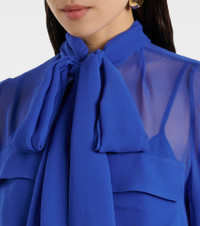 Costarellos captures the essence of modern romance with this silk georgette blouse. With its self-tie bow and sheer-trim, it will add contemporary flair to your wardrobe. Product Details - Material: 100% silk - Care instructions: hand wash - Made in Greece - Designer color name: Electric Blue (721) - Lining: 100% polyester - Closure: buttoned back - Item number: P01005659 Size & Fit - True to size - Designed for a loose fit - Non-stretchy fabric - Falls below the hip - The model seen in the picture is 178cm-5'10" and wearing a size FR 36