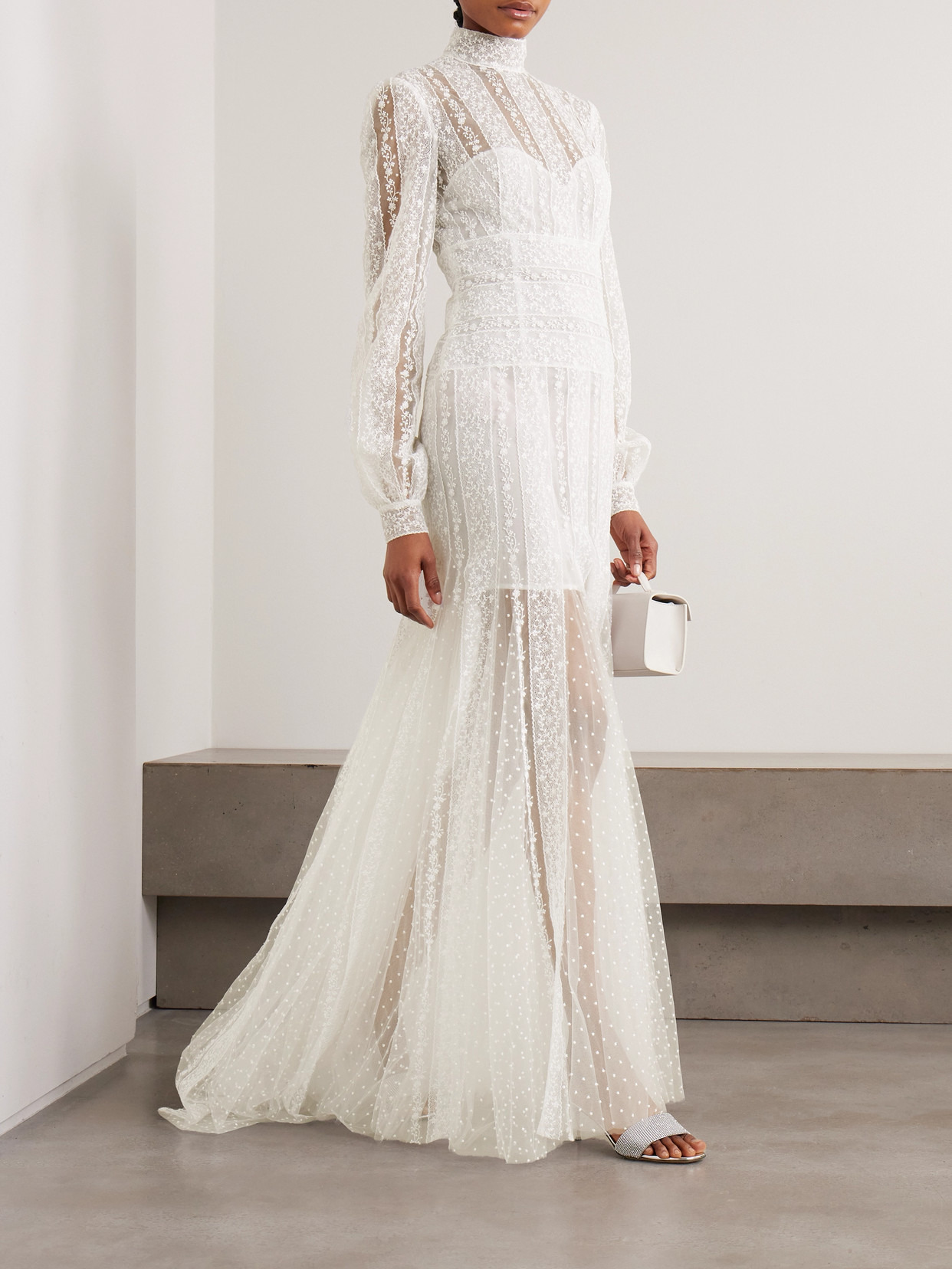 Costarellos' exquisite 'Theia' gown is reminiscent of Victorian styles. Cut from tulle with a high neckline, it's decorated with rows of ornate embroidery and has long sleeves with neat cuffs. Wear yours with sparkling heels to highlight the sweeping godet skirt.