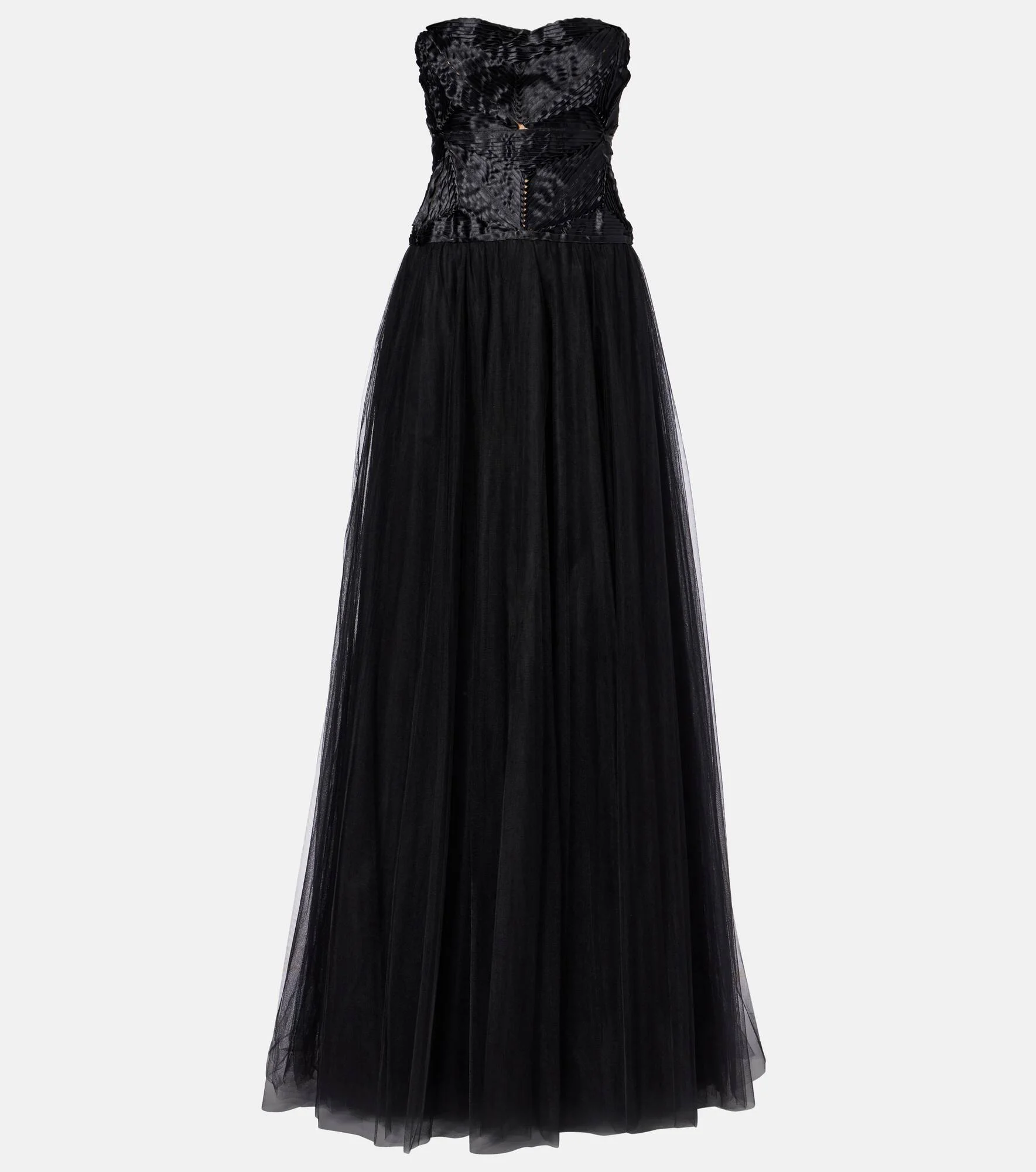 Based in Athens, Costarellos designs ethereal eveningwear that takes inspiration from art of ancient Greece. This captivating tulle gown features a built-in buster, a tulle skirt, and a concealed zipper. Product Details - Material: 100% polyester - Care instructions: dry clean - Made in Italy - Designer color name: Black - Item color: black - Lining: 100% polyamide - Built-in bustier - Closure: concealed zipper, zipped back, hook-fastening back - Item number: P01058439 Size & Fit - True to size - Ideal fit for larger bust sizes - Strapless - Internal corset with underwire support - Cinched waist - Non-stretchy fabric - Padded top - The model seen in the picture is 178cm-5'10" and wearing a size FR 36