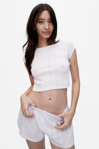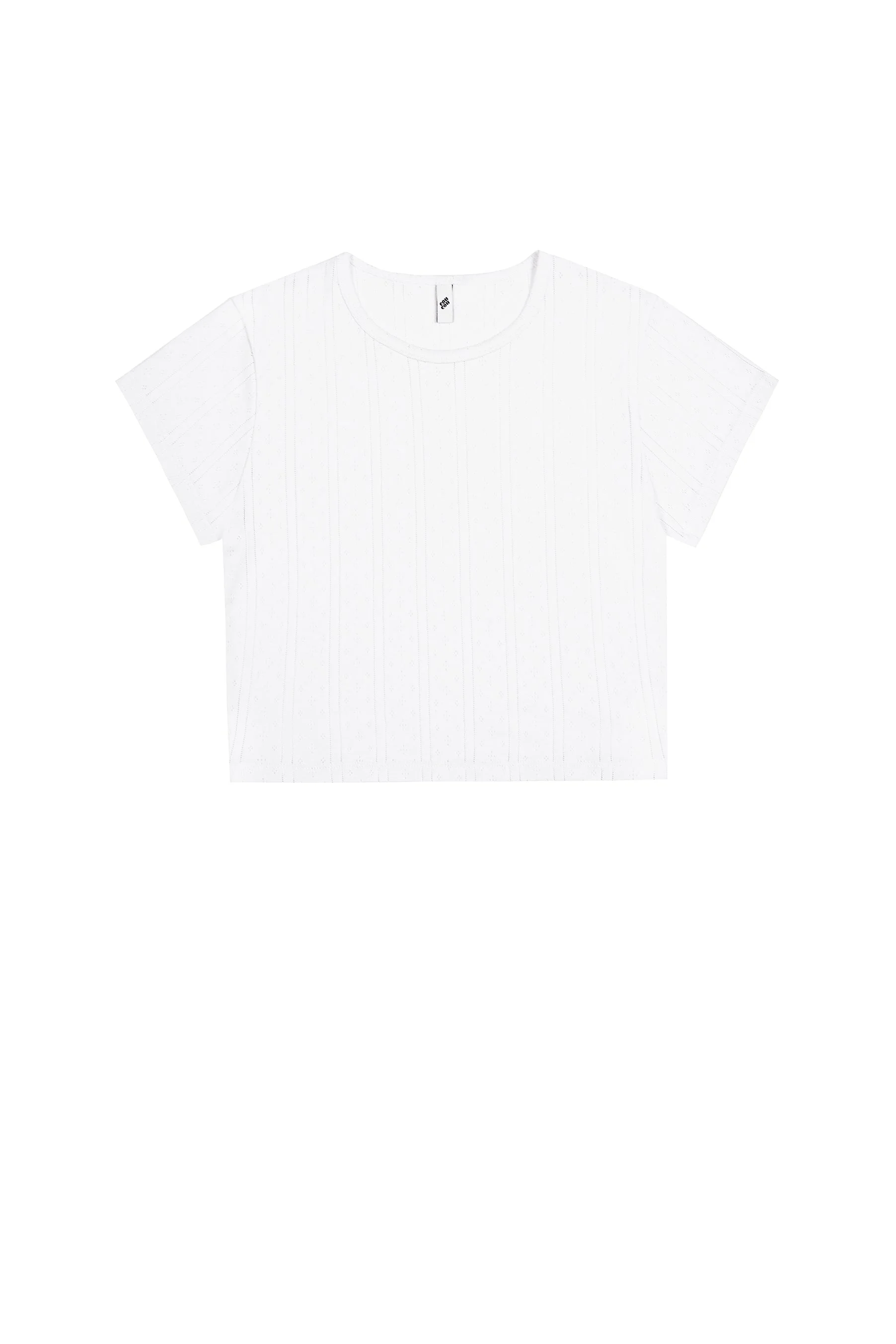 A 90’s cool-girl, nostalgic essential. With a soft, French-cut fit ~ The Baby Tee is your new favourite teeny tiny staple, to dress up or down. Featuring an iconic silhouette, that’s innocent, classic and casual all at once. FABRIC & CARE Consciously made with our signature, bespoke 100% Organic Cotton Pointelle. Fabric: 100% Organic Cotton Pointelle Take Care: Wash on gentle, lay flat to dry. Designed in London. Made in Portugal. SIZE & FIT Shrunken fit, with a cropped body and scoop neck. The Baby Tee fits true to size. Size up for a more relaxed or longer fit. In order of appearance: Carmen wears a size L. Sabina wears an XS. Rene wears a S in The Baby Tee.