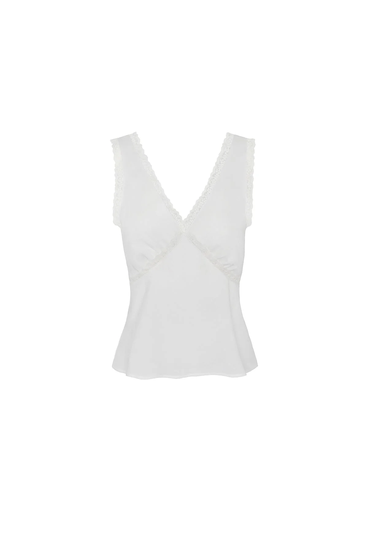 Vintage-inspired with a flirty v-neck silhouette, The Iris Tank features a bias-cut and waist ties to cinch for the perfect fit. Consciously made with 100% Organic Cotton Voile & French Lace. FABRIC & CARE Effortless & romantic, our dreamy Cotton-Voile collection reimagines your classic vintage favorites in super-soft & semi-sheer 100% organic cotton and French lace. Consciously made with 100% Organic Cotton Voile. Fabric: 100% Organic Cotton Voile French Lace: 84% Polyamide, 16% Rayonne To take care and keep your Cou Cou's looking cuter, for longer, just wash your pieces on gentle, lay flat to dry & voila! These more gentle care methods aren’t just better for your Cou Cou's, they’re better for the planet, too. Designed in London. Made in Morocco. SIZE & FIT The Iris Tank is considered true to size, but if in between sizes, if you have larger breasts or simply prefer a looser fit we recommend sizing up. Vintage inspired, bias-cut tank Flirty v-neck silhouette 100% organic cotton-voile Floral French lace trim Waist ties to cinch for the perfect fit. In order of appearance: Olga wears an S, Jade wears an XS, Noor wears an L in The Iris Tank.