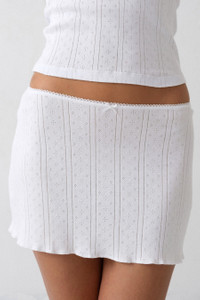 The easy, throw-on mini skirt you need. Sweet & sultry, pair with kitten heels to take you from bookstore to bistro or a vintage tee for a laid-back, effortless look. FABRIC & CARE Consciously made with our signature, bespoke 100% Organic Cotton Pointelle. Fabric: 100% Organic Cotton Pointelle Picot Trim: 70% Polyamide and 30% Spandex To take care and keep your Cou Cou's looking cuter, for longer, just wash your pieces on gentle, lay flat to dry & voila! These more gentle care methods aren’t just better for your Cou Cou's, they’re better for the planet, too. Designed in London. Made in Morocco. SIZE & FIT Mini length, featuring picot-trim detailing & finished with a baby center-front bow. The Mini Skirt fits true to size but if you’re in-between sizes or have a fuller bum, we recommend sizing up. In order of appearance: Isabella & Jade wear The Mini Skirt in XS.