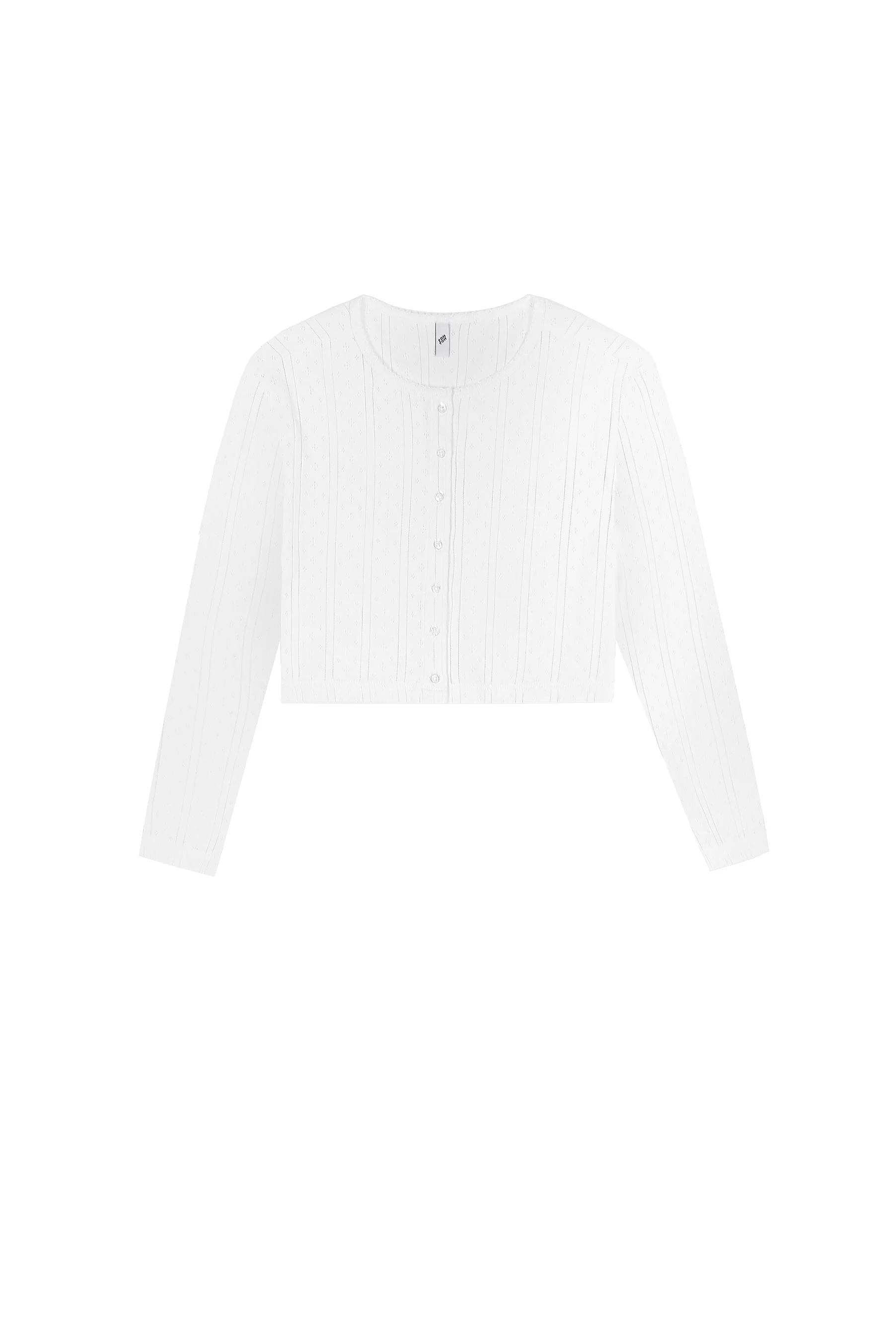 For the days it’s cold-ish. The Crop Cardi is our take on that flirty, boxy cardi your mom used to wear in the 80’s ~ cropped a la Cou Cou. Featuring a shrunken fit, delicate picot detailing on the neckline and petit front-button fastening. FABRIC & CARE Consciously made with our signature, bespoke 100% Organic Cotton Pointelle. Fabric: 100% Organic Cotton Pointelle To take care and keep your Cou Cou's looking cuter, for longer, just wash your pieces on gentle, lay flat to dry & voila! These more gentle care methods aren’t just better for your Cou Cou's, they’re better for the planet, too. Designed in London. Made in Portugal. SIZE & FIT Featuring a shrunken fit, delicate picot detailing on the neckline and petit front-button fastening. The Crop Cardi is considered true to size. If you prefer a more shrunken fit, size down. If you would prefer a looser fit or have a bigger bust, we recommend sizing up. In order of appearance: Lua wears a S. Sabina wears an XS. Sylvie wears an XL in The Crop Cardi.