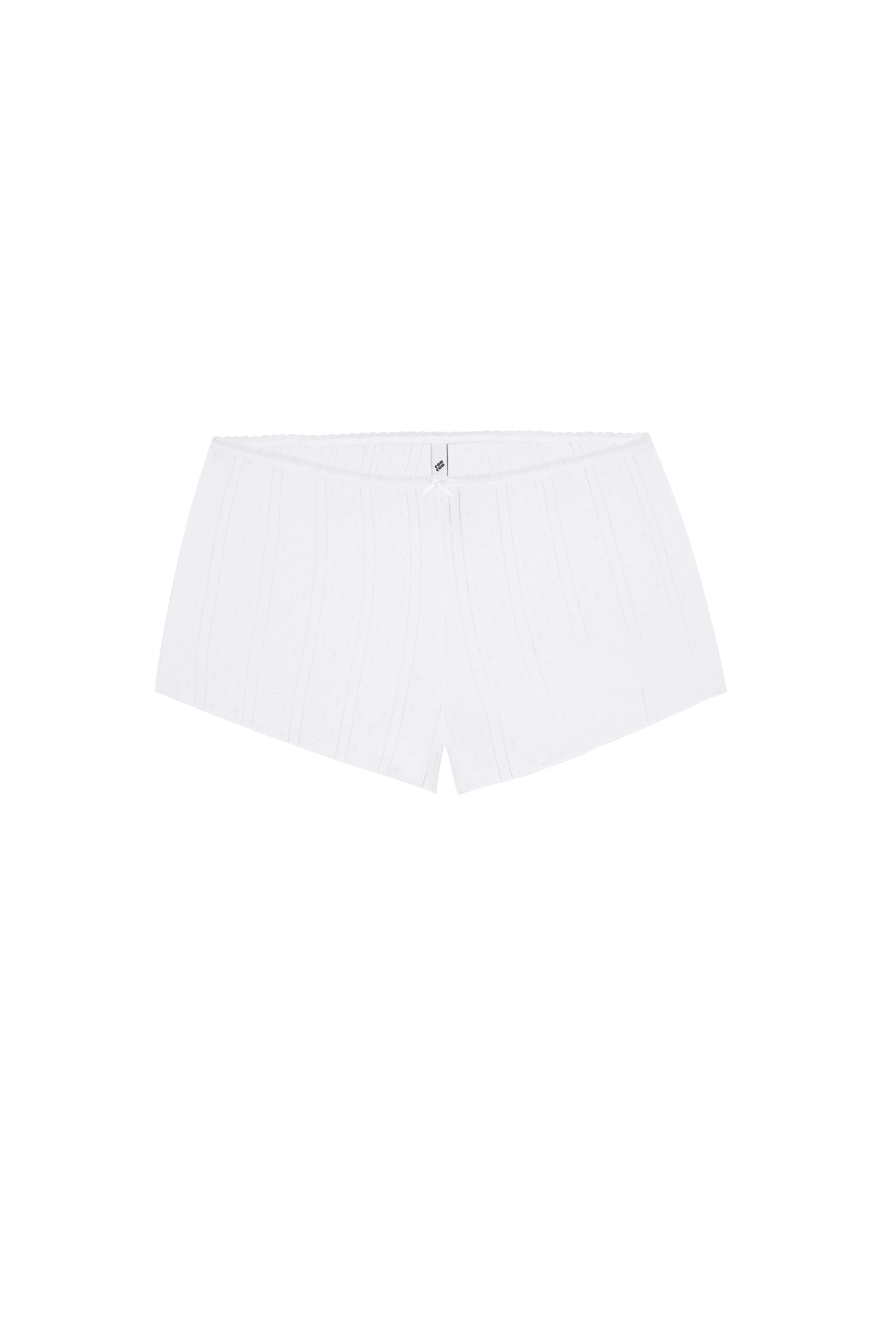 She’s teeny. She’s tiny. She’s the flirty, micro short you’ve been looking for. Throw on with a bikini top for summer vibes, pair with your favourite oversized blouse for an off-duty-moment or go commando and wear them as your comfiest, full-coverage undies. FABRIC & CARE Consciously made with our signature, bespoke 100% Organic Cotton Pointelle. Fabric: 100% Organic Cotton Pointelle French Lace: 90% Polyamide and 10% Elastane To take care and keep your Cou Cou's looking cuter, for longer, just wash your pieces on gentle, lay flat to dry & voila! These more gentle care methods aren’t just better for your Cou Cou's, they’re better for the planet, too. Designed in London. Made in Portugal. SIZE & FIT Micro short, intended for a close fit. Finished with French Lace detailing & a petit centre-front bow. The Teeny Tiny Short fits true to size, so take your normal size. If you’re in between sizes, we recommend sizing up for comfy, cuteness – or sizing down if you’re going for a more fitted look. In order of appearance: Isabella wears a size XS. Nena wears a S. Jade wears an XS and Carmen wears a XL in The Teeny Tiny Short.