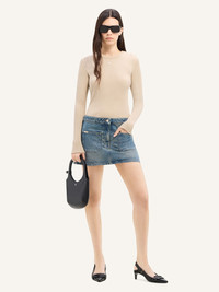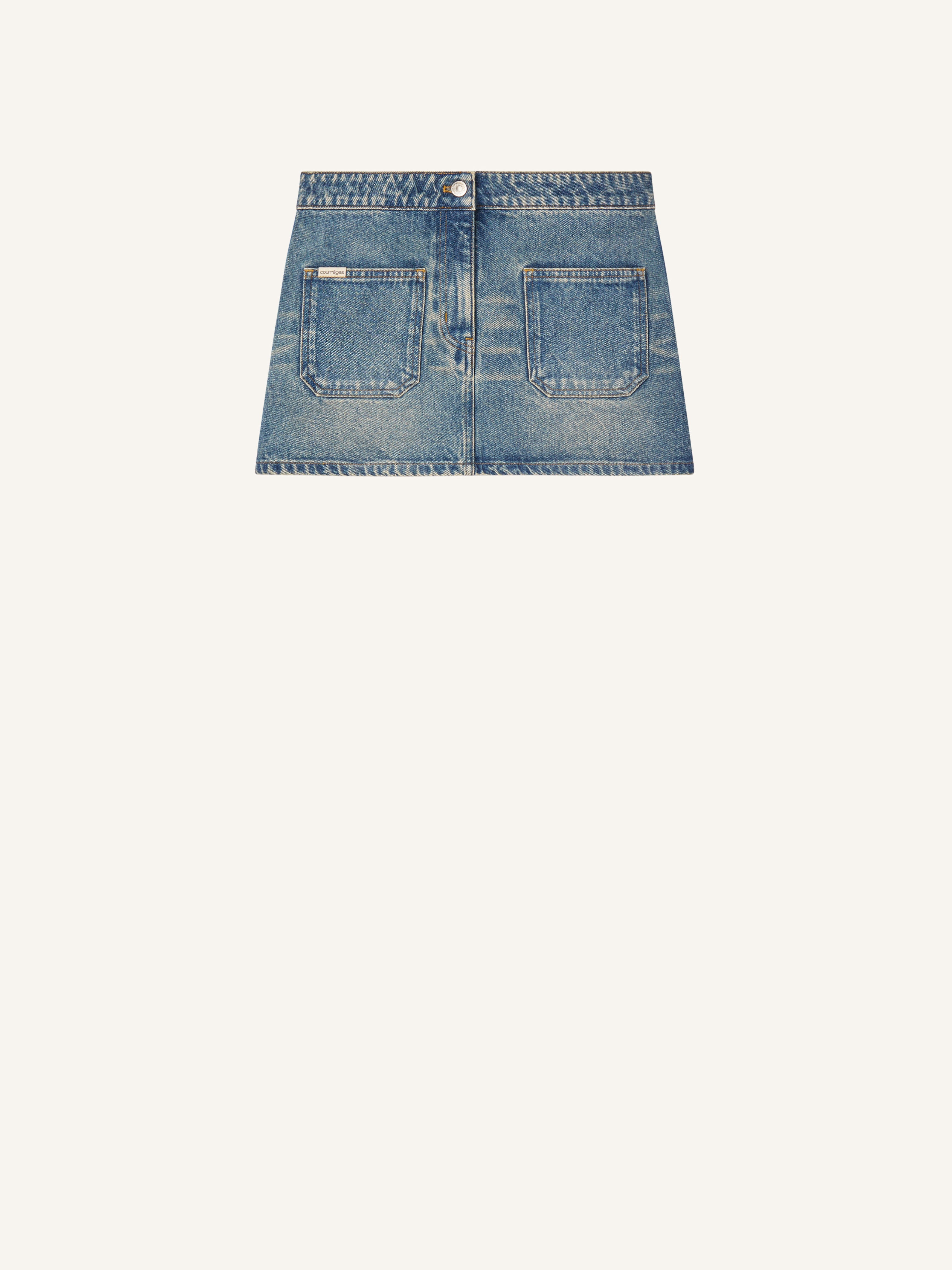 Trapeze denim mini skirt with two patch pockets and Courreges logo on the front. The model is 1.75m tall and wears a size 26. DETAILS Composition: 100% cotton Country of Manufacture: IT SKU: 324DJU191DE00337052 Color: Vintage Medium Blue