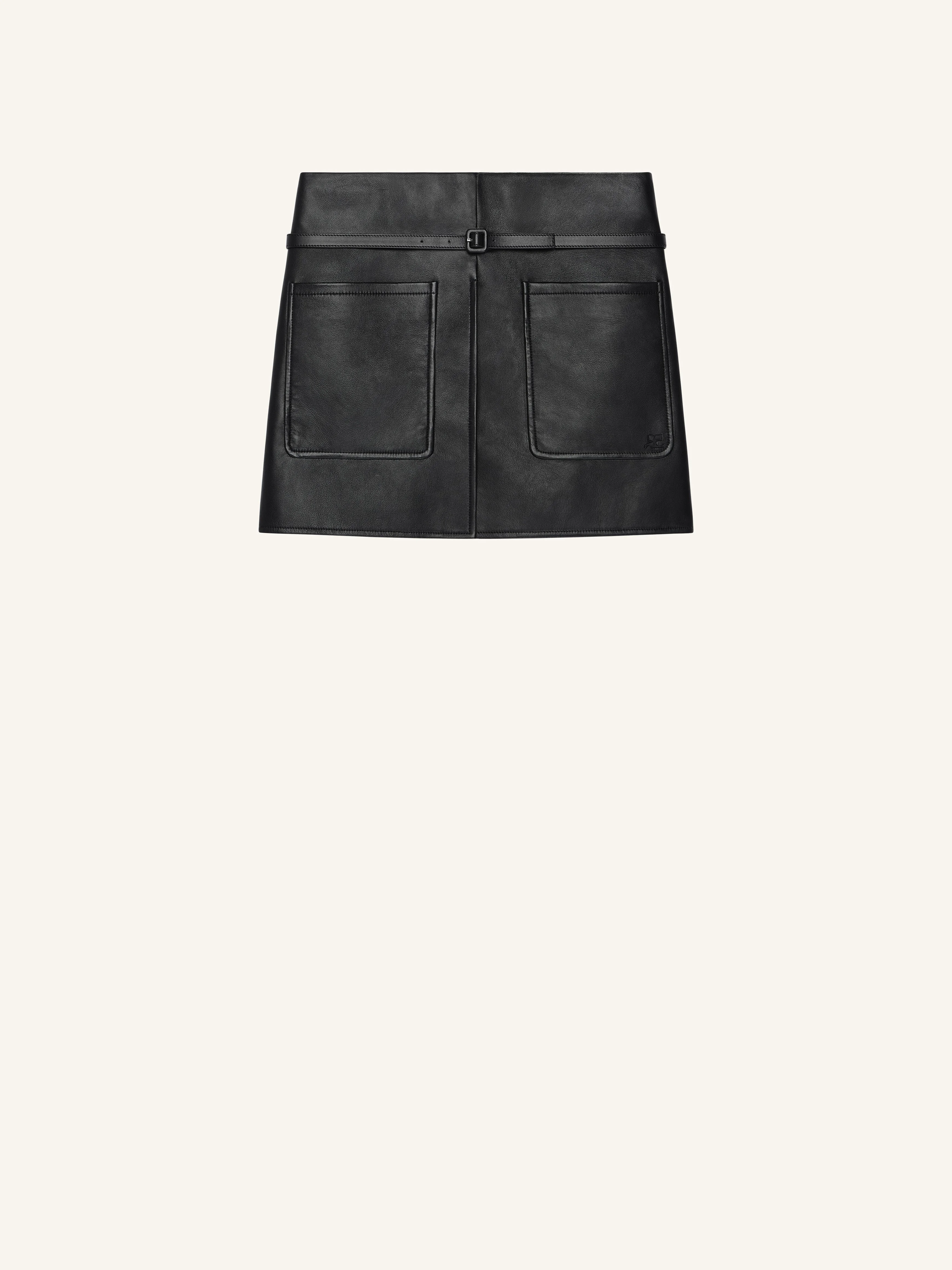 Short leather skirt with two patch pockets at the front and a central slit. Thin adjustable belt at the waist and ‘Courreges’ logo on jacron label at the back. The model is 1.76m and wears a size 36. DETAILS Composition: 100% lamb leather Country of Manufacture: FR SKU: 226LJU368CV00059999 Color: Black
