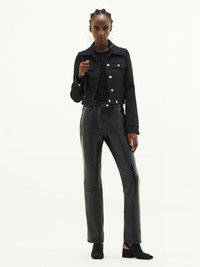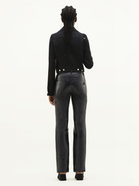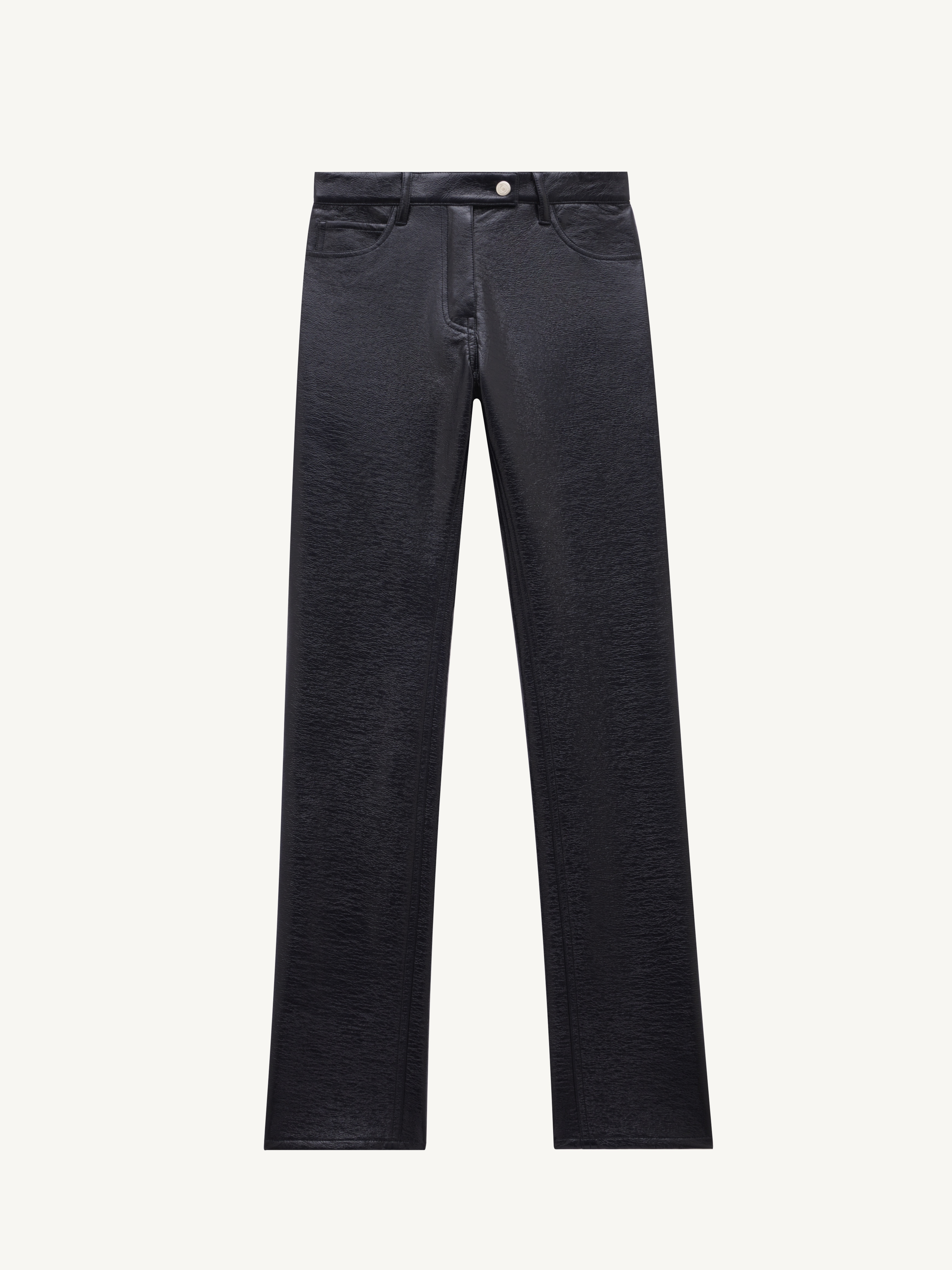 Vinyl pants with tone-on-tone logo on the back pocket. Closure fly style Courrèges with zip and lacquered pressure. Two Italian pockets on the side, two patch pockets on the back. Model not lined. DETAILS Composition : 88% COTON 10% POLYURETHANE 2% ELASTHANE 100% COTON Color : Navy Item code : PERCPA013VY00147075