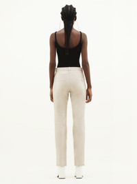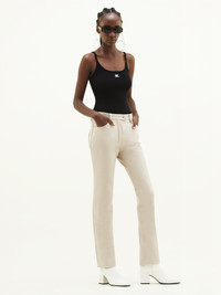 Vinyl pants with tone-on-tone logo on the back pocket. Closure fly style Courrèges with zip and lacquered pressure. Two Italian pockets on the side, two patch pockets on the back. Model not lined. DETAILS Composition : 88% COTON 10% POLYURETHANE 2% ELASTHANE 100% COTON Color : Mastic Item code : PERCPA013VY00149100