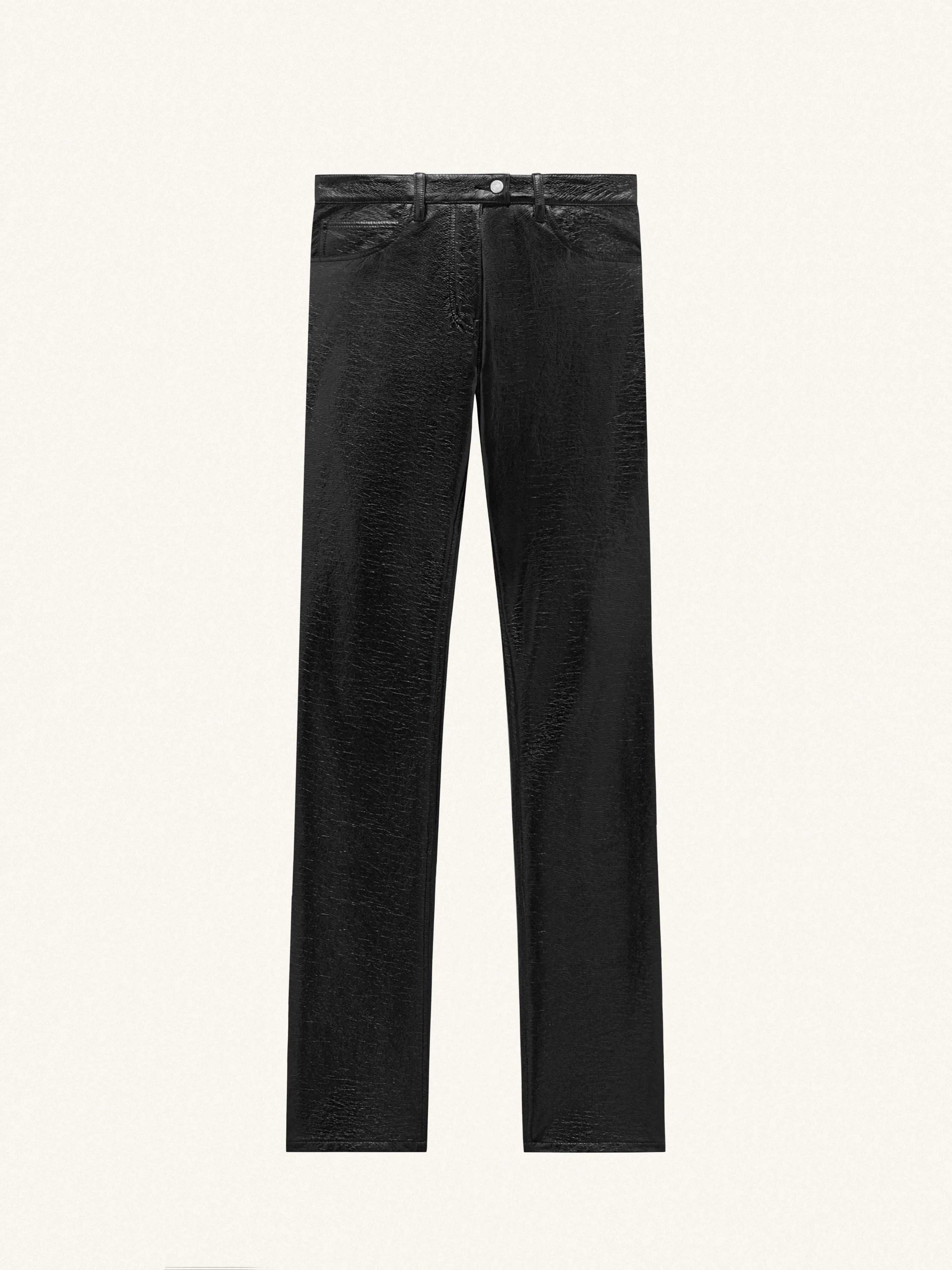 Vinyl pants with tone-on-tone logo on the back pocket. Closure fly style Courrèges with zip and lacquered pressure. Two Italian pockets on the side, two patch pockets on the back. Model not lined. DETAILS Composition : 88% COTON 10% POLYURETHANE 2% ELASTHANE 100% COTON Color : Black Item code : PERCPA013VY00149999