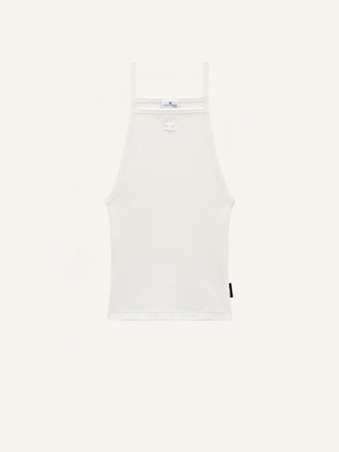 Classic 90's rib tank top with high straight neckline and AC logo. DETAILS Composition: 95% Cotton 5% Elastane Country of manufacture: Bulgaria Color: Heritage White Item code: 323JDE048JS0005