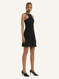 Short sleeveless A-line dress with racer back and button detail on shoulder strap. Zip fastening and two front welt pockets. The model is 1.75m tall and wears a size 36. DETAILS Composition: 89% polyester, 11% polyurethane Country of Manufacture: RS SKU: 125CRO581PL01599999 Color: Black