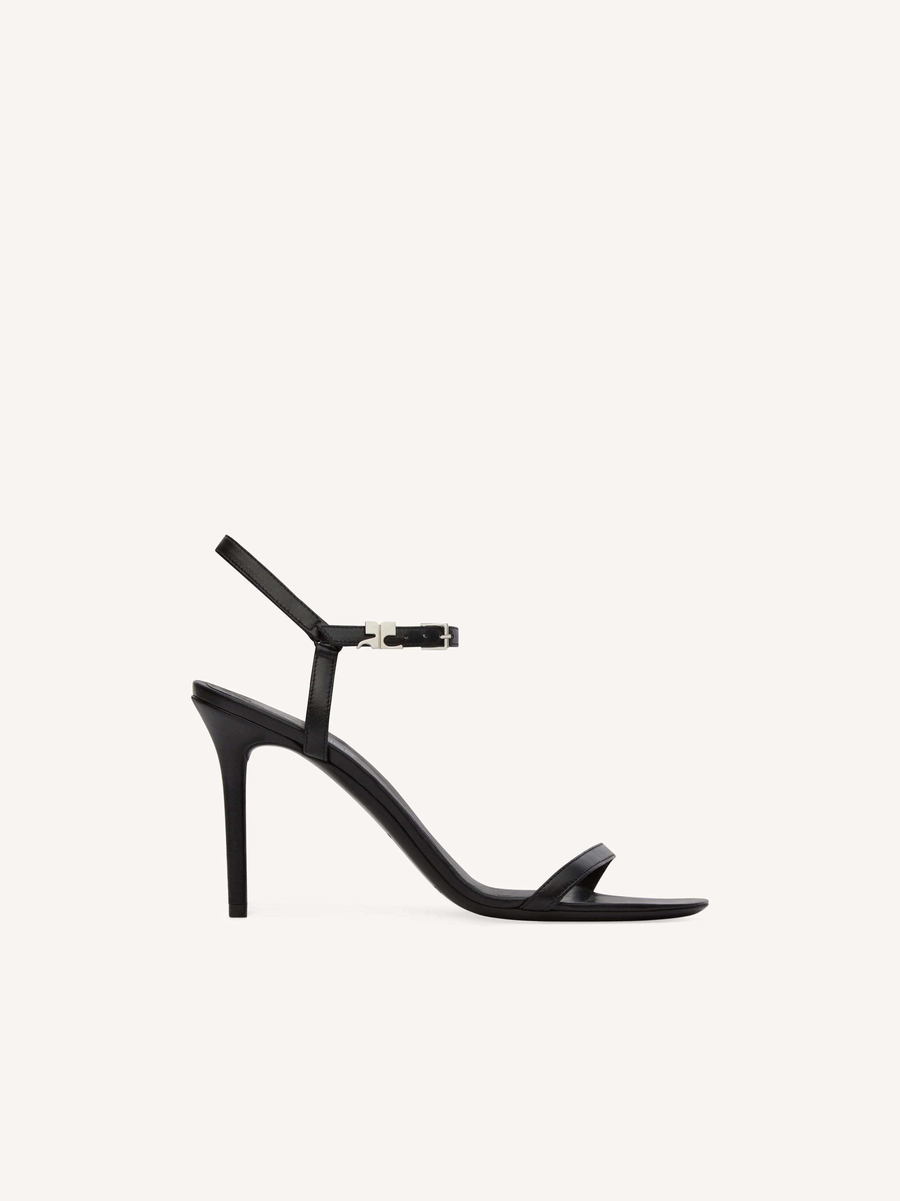 Heeled sandals in lambskin, adorned with a thin strap at the front. Thin ankle strap with metal AC buckle. Heel height : 90 mm DETAILS Composition: 100% sheep leather Country of Manufacture: IT SKU: 125SSD028AG00309999 Color: Black