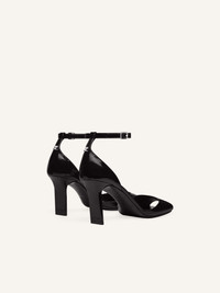 Square open toe vinyl sandals adorned with a metal buckle strap that highlights the ankle and a lacquered heel. Metallic AC logo at the back. DETAILS Composition: 88% cotton, 10% polyurethane, 2% elastane Country of Manufacture: IT SKU: 425SPP045VY00149999 Color: Black