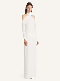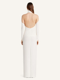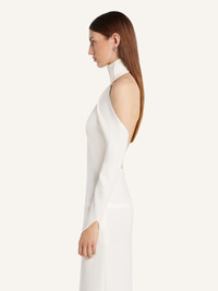 Mockneck gown with oblique sleeves. Bare back and shoulders. The model is 1.77m tall and wears a size 36. DETAILS Composition: 89% polyester, 11% polyurethane Country of Manufacture: IT SKU: 325CRO683PL01590001 Color: Heritage White