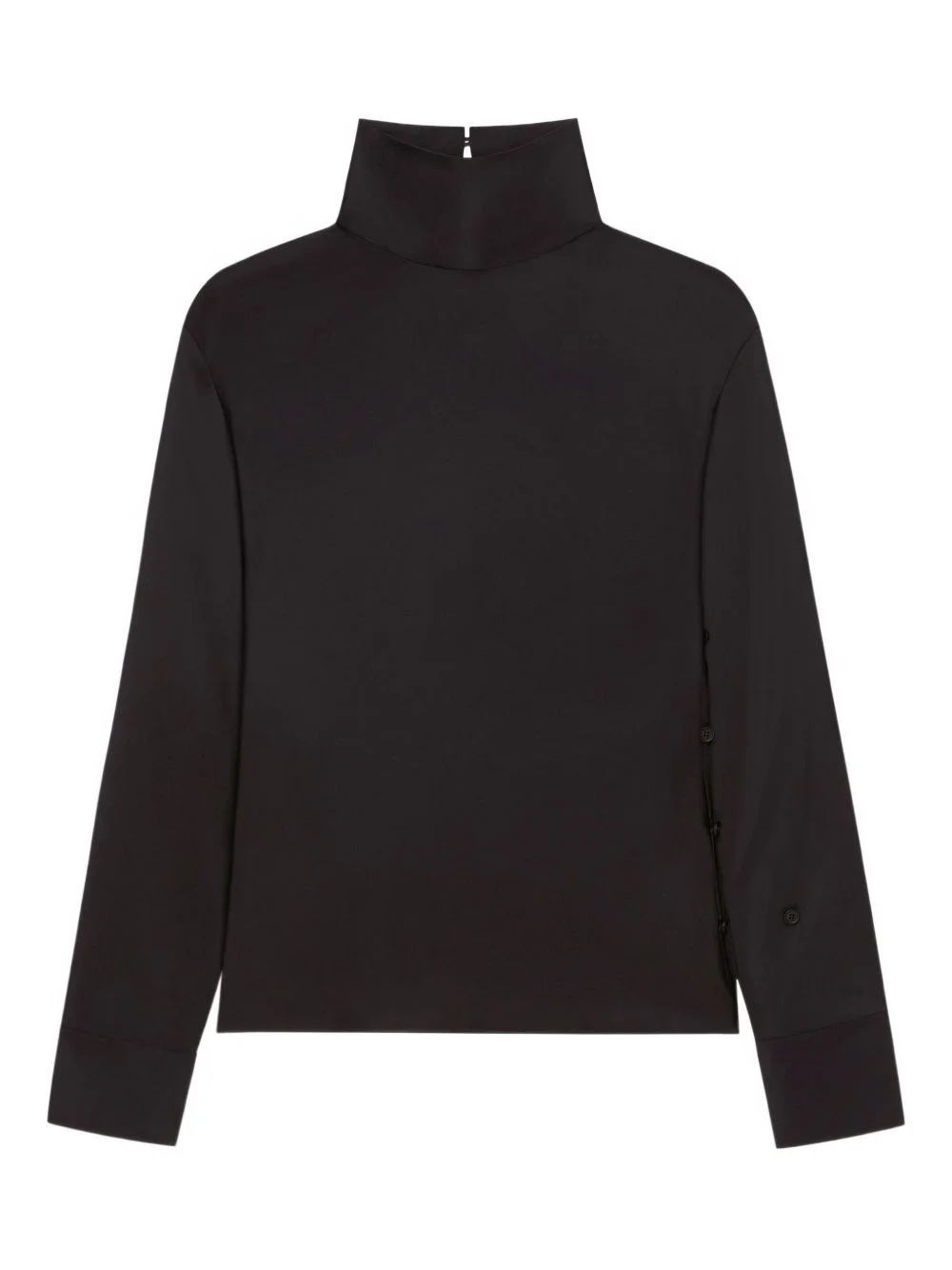 asymmetric top Highlights - Black - Asymmetric design - Mock neck - One shoulder - Rear button fastening Made in Italy Composition Viscose Satin 94%, Elastane 6% Washing instructions Read Manufacturer Guidelines