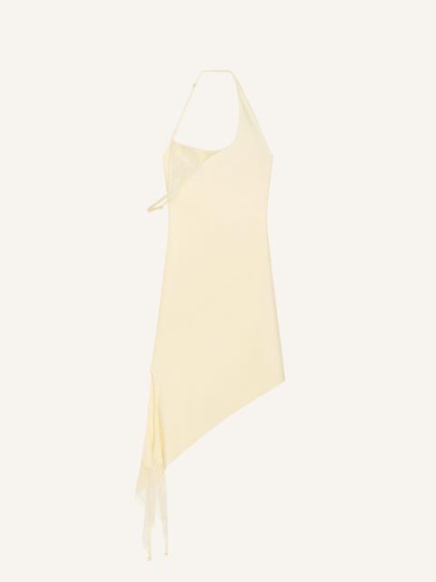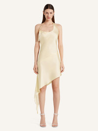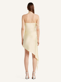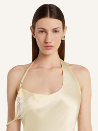 Asymmetrical satin dress with thin straps. Lace side slit and dropped strap. The model is 1.77m tall and wears a size 36. DETAILS Composition: 94% viscose, 6% elastane Country of Manufacture: IT SKU: 325CRO667VI00732031 Color: Limoncello