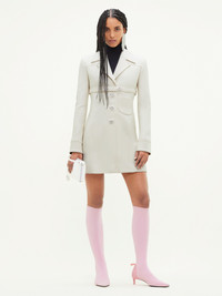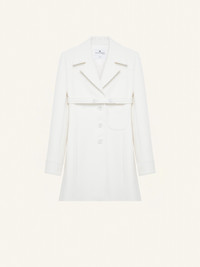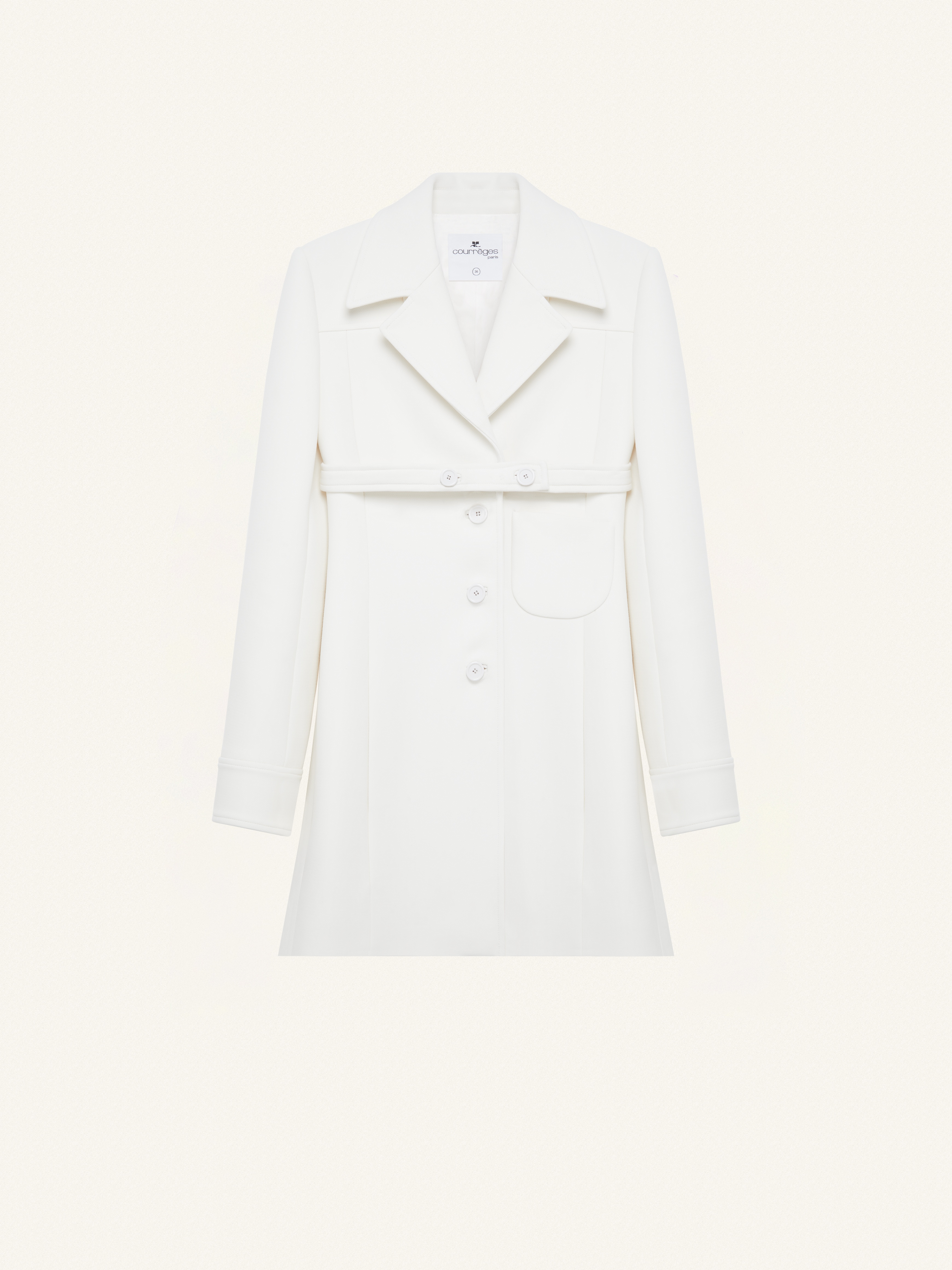 Short fitted crepe tailored coat with 3 front buttons and buttoned cuffs. One single front pocket and adjustable chest belt. DETAILS Composition: 52% Viscose 26% Polyamide 18% Virgin wool 4% Elastane Country of manufacture: Italy Color: Heritage White Item code: 323CMA104VI0040