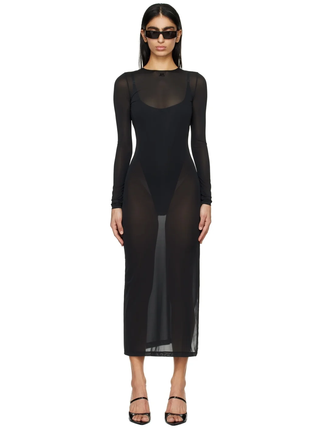 Semi-sheer stretch polyester jersey dress. · Crewneck · Logo embroidered at front · Slit at side seam · Adjustable hook-eye strap at back collar · Open back Supplier color: Black