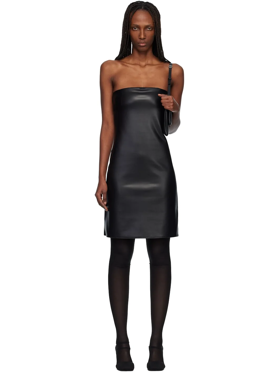 Faux-leather minidress. · Straight neck · Logo embroidered at front · Adjustable hook-eye fastening at back · Integrated bra-style stretch mesh lining Supplier color: Black Body: 54% polyurethane, 48% polyester. Trim: 79% nylon, 21% elastane. Made in France 252783F052016