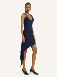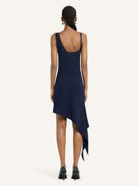 Asymmetrical dress with tied scarf on the shoulder and side slit. The model is 1.75m tall and wears a size 36. DETAILS Composition: 100% polyester Country of Manufacture: IT SKU: 125CRO538PL01477075 Color: Navy
