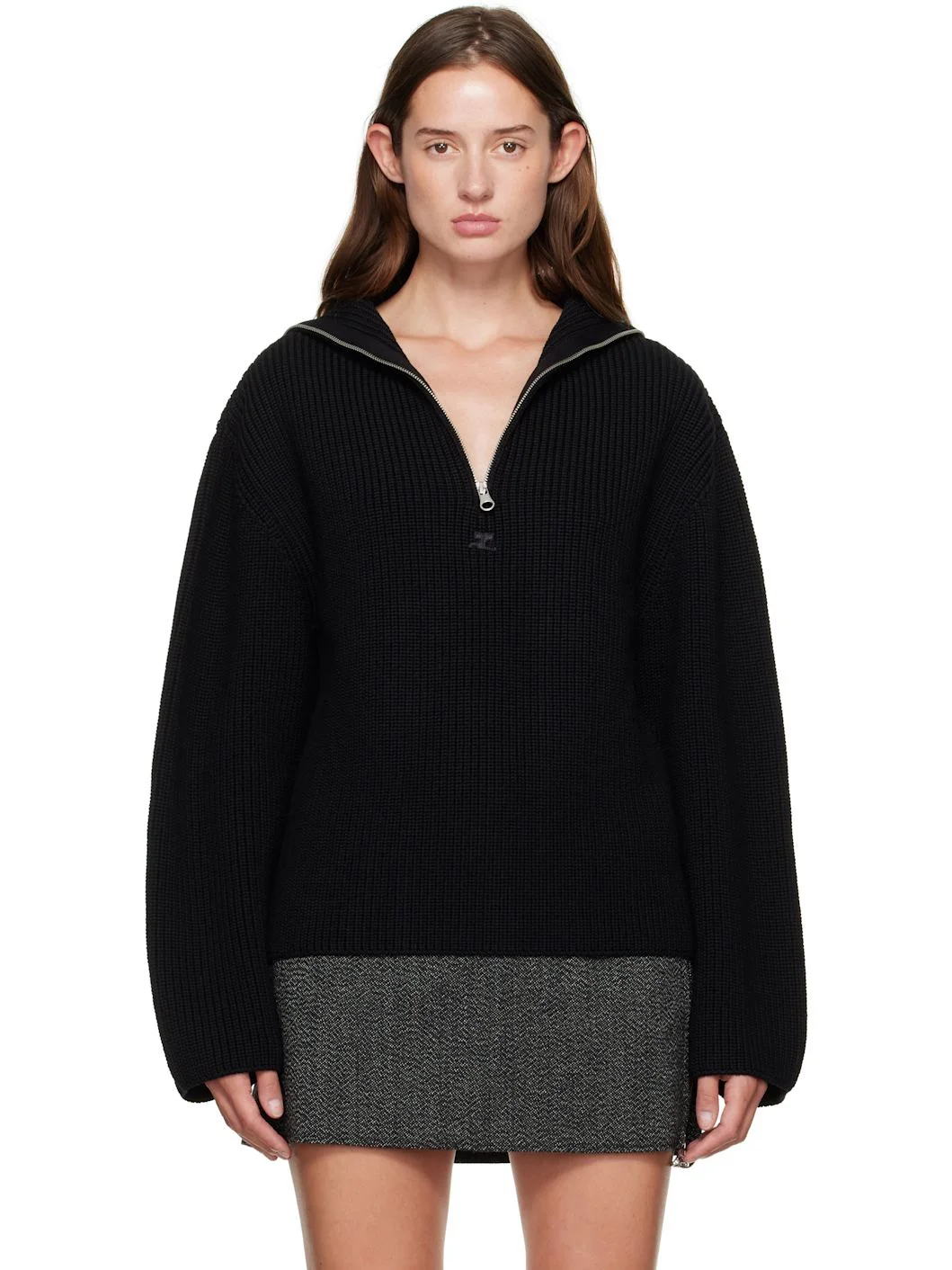 Rib-knit merino wool sweater. · Funnel neck · Half-zip closure · Logo embroidered at chest · Dropped shoulders Supplier color: Black 100% merino wool. Made in Portugal 252783F097005