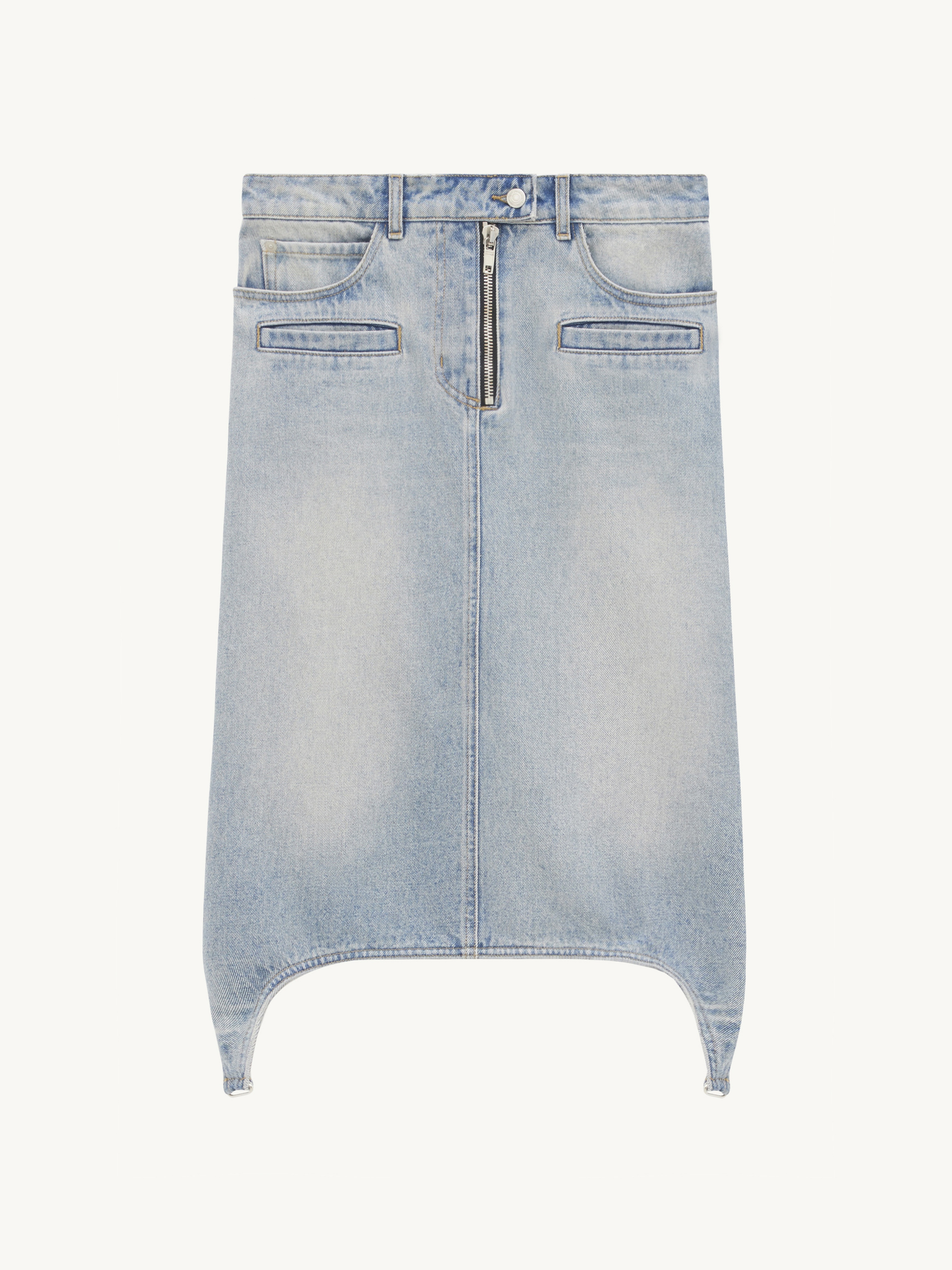 Long dirty blue denim skirt with zip fly, heritage pockets, metallic suspenders and metallic button. DETAILS Composition: 100% Cotton Color: Light Blue Wash Country of manufacture: Tunisia Item code: 123DJU082DE00167011