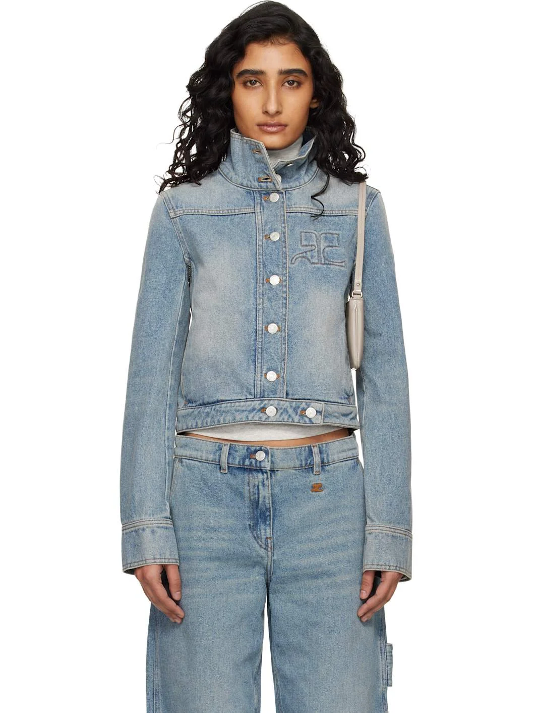 Non-stretch denim jacket. · Fading throughout · Stand collar · Button closure · Logo embossed at chest · Seam pockets at waist · Buttoned barrel cuffs · Contrast stitching in tan · Logo-engraved silver-tone hardware Part of the Reedition collection. Supplier color: Denim blue Body: 100% cotton. Trim: 65% polyester, 35% cotton. Made in Tunisia 261783F060000