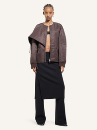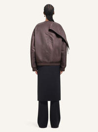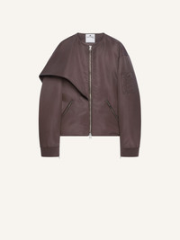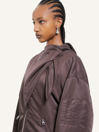 Oversized bomber with zipper at front. Bow collar can be knotted. Long sleeves with pocket on the arm and AC logo. Zipped side pockets. The model is 1.75m tall and wears a size S. DETAILS Composition: 100% polyamide Country of Manufacture: LT SKU: 424CBL218NY00201983 Color: Chocolate